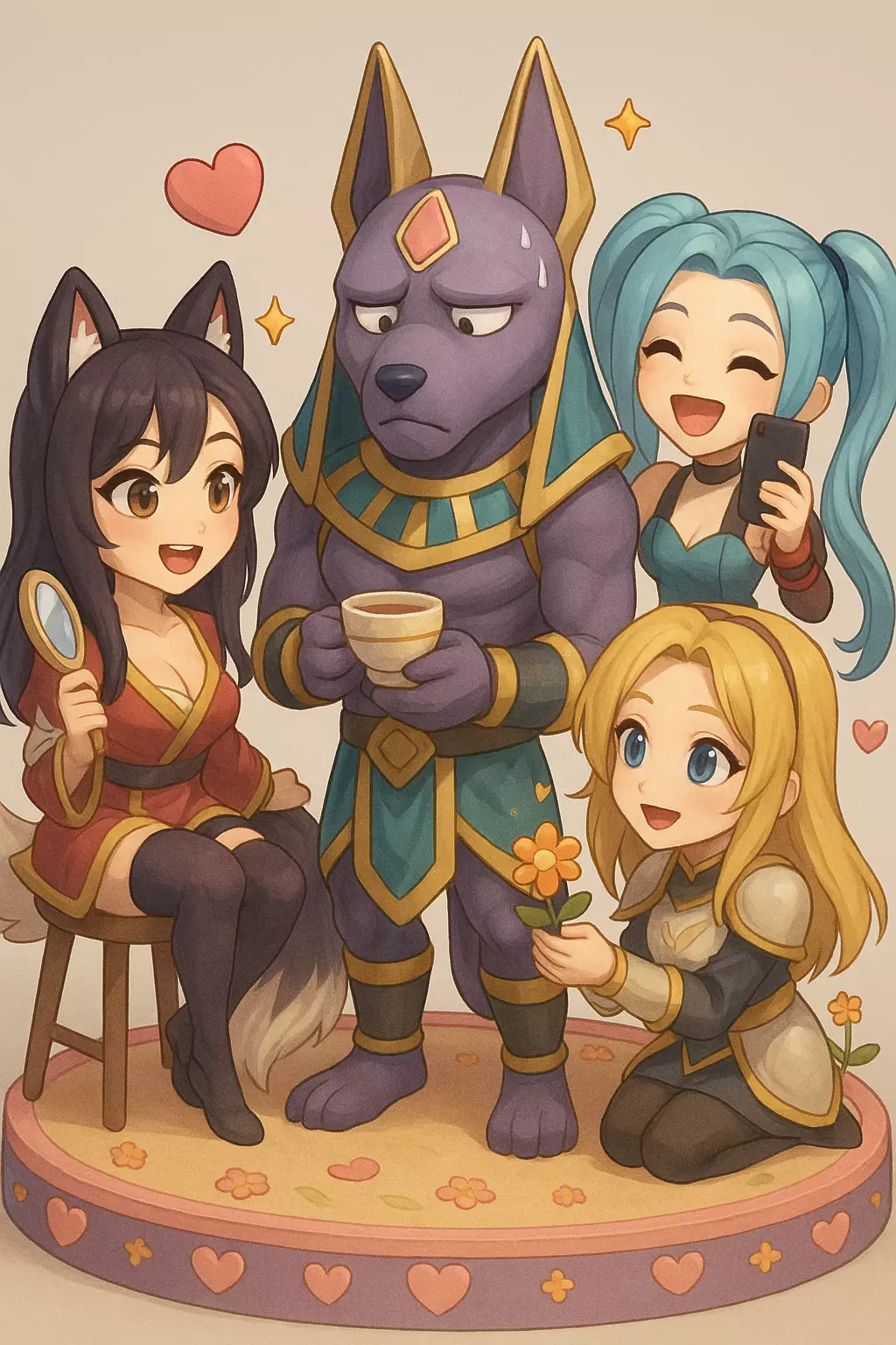 This 3D printable scene features three fan-favorite female champions – Lux, Ahri, and Jinx – in adorable, chibi-inspired poses full of life and personality. Standing among them, looking hilariously out of place, is Nasus, visibly annoyed to be surrounded by giggling, playful girls.