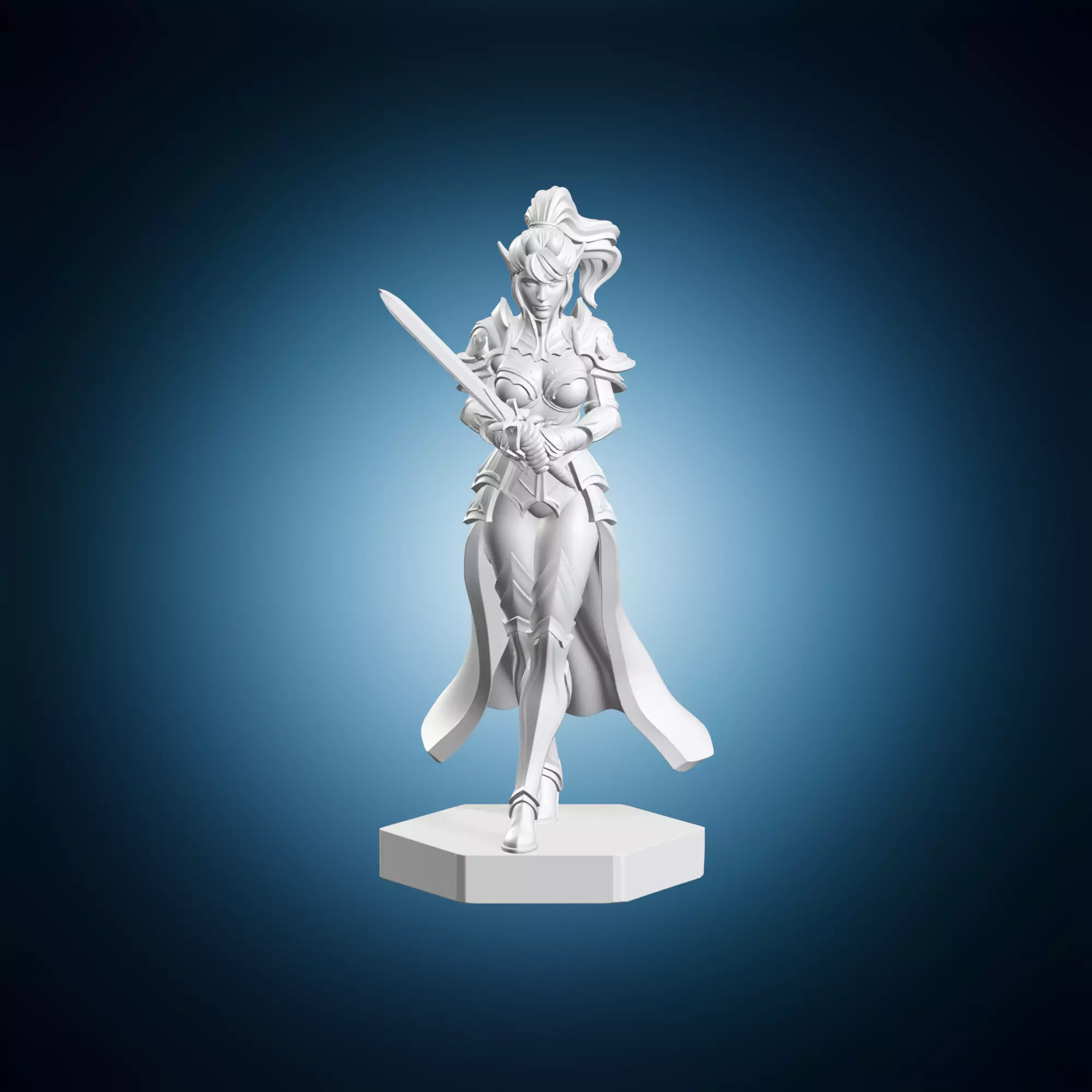 A detailed 3D model of a female elf warrior figure with a sword and shield, sitting on a pedestal base. The model is designed to be a realistic representation of a fantasy character, perfect for use in games, simulations, or as a decorative piece. It features intricate details such as armor, clothing, and accessories. The model is suitable for various industries including art, architecture, and entertainment.