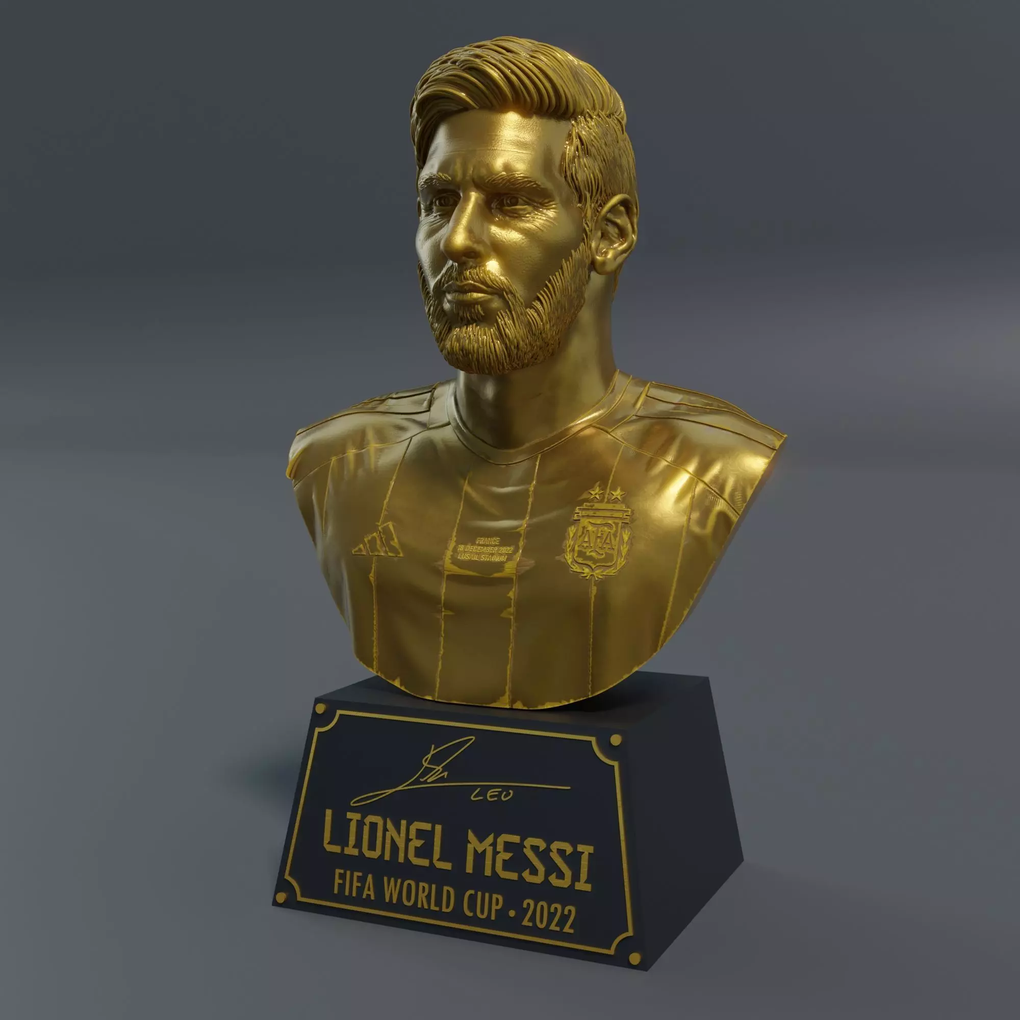 This is a bust of Lionel Messi, created from photos taken at the 2022 FIFA World Cup. The sculpture is at 1:3 scale and stands 25.9cm tall. It's designed for two printing methods: the base—split into separate parts so you can do multi-colour prints—is meant for FDM, while the bust itself works best in resin. Buy it and you get a Blender file with materials, textures and lighting set up for rendering, plus STL files ready to print. In the pics and guides here you have everything to assemble it exactly like the render or my own photos.