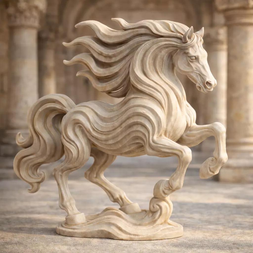 - LithoMane Horse – Stone Flow Sculpture- Abstract CNC & Architectural Sculpture Model- Description- LithoMane Horse is a premium abstract horse sculpture inspired by the natural flow of stone strata and organic motion. The design features smooth, layered curves that create a powerful sense of movement, strength, and elegance—making it ideal for CNC stone carving, architectural décor, luxury interiors, and gallery-style installations.- The flowing mane and sculpted body are optimized to highlight depth and shadow in stone materials such as antique limestone, marble, sandstone, soapstone, and metal finishes, ensuring excellent visual results in both real-world fabrication and high-end renders.- This model is designed with clean geometry and balanced proportions, suitable for heritage projects, palace courtyards, museum displays, modern art spaces, and premium exterior or interior décor.- Recommended Materials (Render & Fabrication)