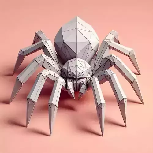 A stylized geometric spider with low-poly faceted surfaces and sharp angular forms, outlined in black for emphasis. Its multiple legs spread dynamically, creating a bold, modern silhouette against a soft peach background. Minimalist and precise, this clean design balances simplicity with striking geometric detail.