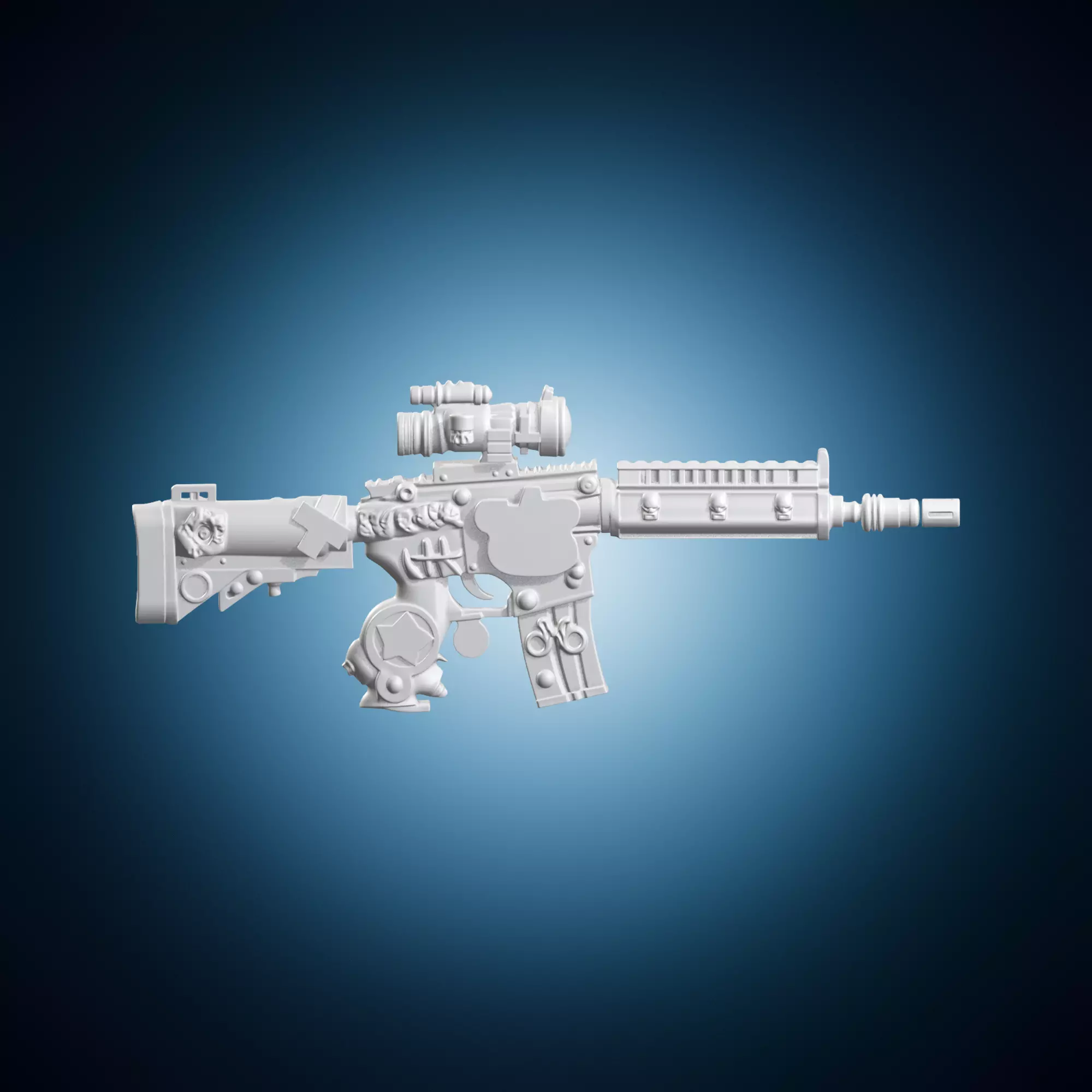 A cartoon representation of an M4A1 assault rifle. This model is designed to showcase the iconic design of this popular firearm in a stylized format. It can be used for various purposes such as gaming, animation, or illustration. The model features detailed textures and shading to give it a realistic appearance. It is compatible with most 3D modeling software and can be easily edited or modified to suit different needs.