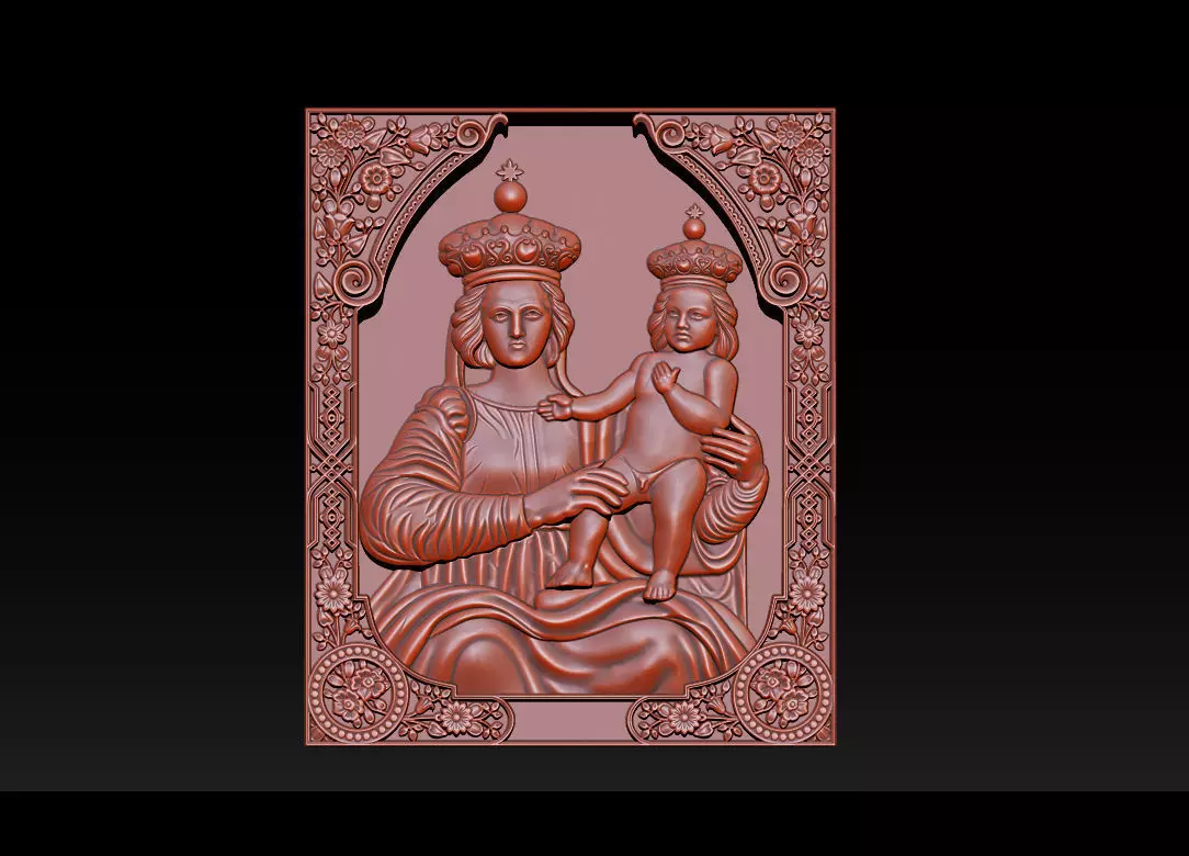 Bas relief of the Madonna and Baby is recreated in high polygon 3D model in the frame.