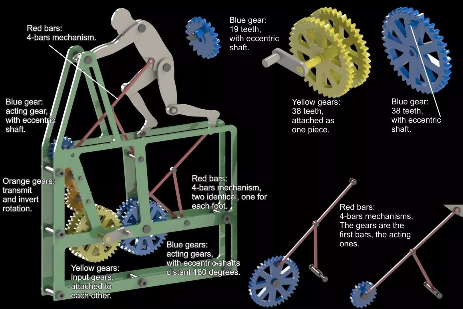 There are some examples, and this one was quite interesting, a man walking and pushing something. Basically, it uses 2 identical 4-bars mechanisms to move the feet, and another 4-bars to move the body. Simple and efficient