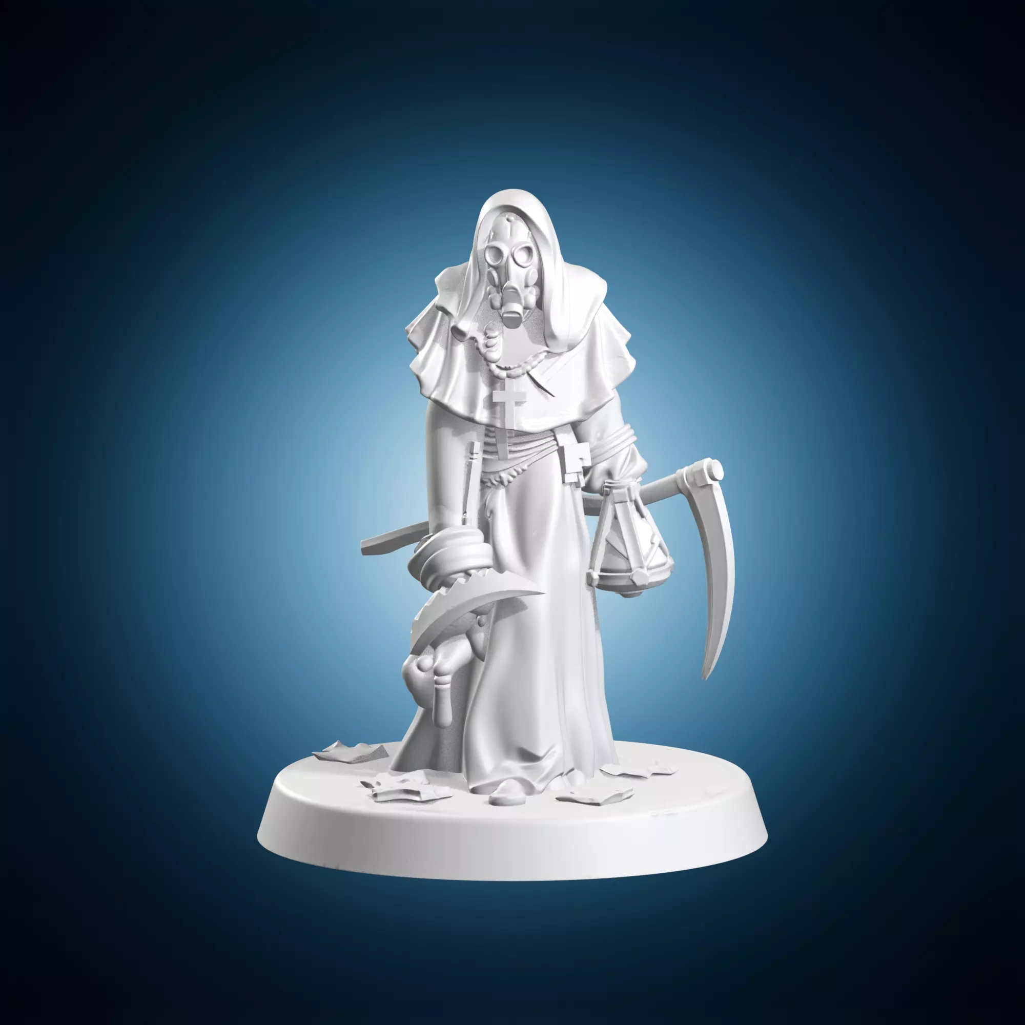 A miniature sculpture of a masked nun wielding a plague doctor's scythe, inspired by medieval European folklore and heraldry. This piece is part of a larger collection of historical figures in a stylized, modernist aesthetic. The Masked Nun Plague Doctor Scythe is a unique blend of art and history, evoking the dark mysticism of the plague era. Its intricate details and ornate design make it a standout piece for any collector or fan of historical reenactments. Crafted with precision and attention to detail, this miniature sculpture is sure to captivate those who appreciate the intersection of art and history.