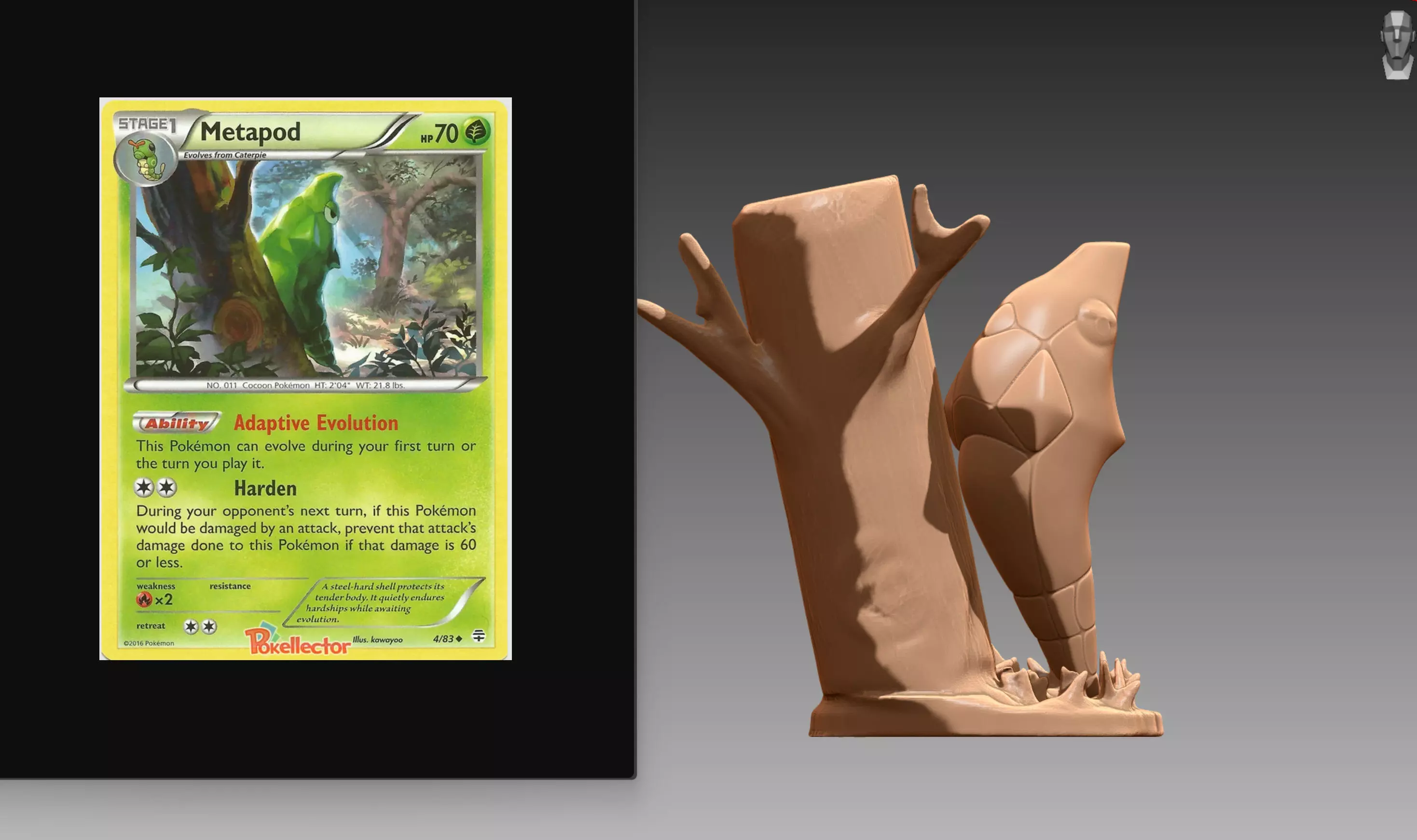 Metapod's soft body is protected by a hard outer shell as it undergoes metamorphosis. While this shell is said to be as hard as steel, a sudden, powerful impact could cause its liquid innards to pop out, leaving it completely exposed. Metapod generally remains motionless, rebuilding its cells for evolution. If an enemy discovers Metapod, it is unable to do anything other than harden its outer shell. Metapod lives in temperate forests and jungles, often in groups. Pikipek is a natural predator of Metapod.