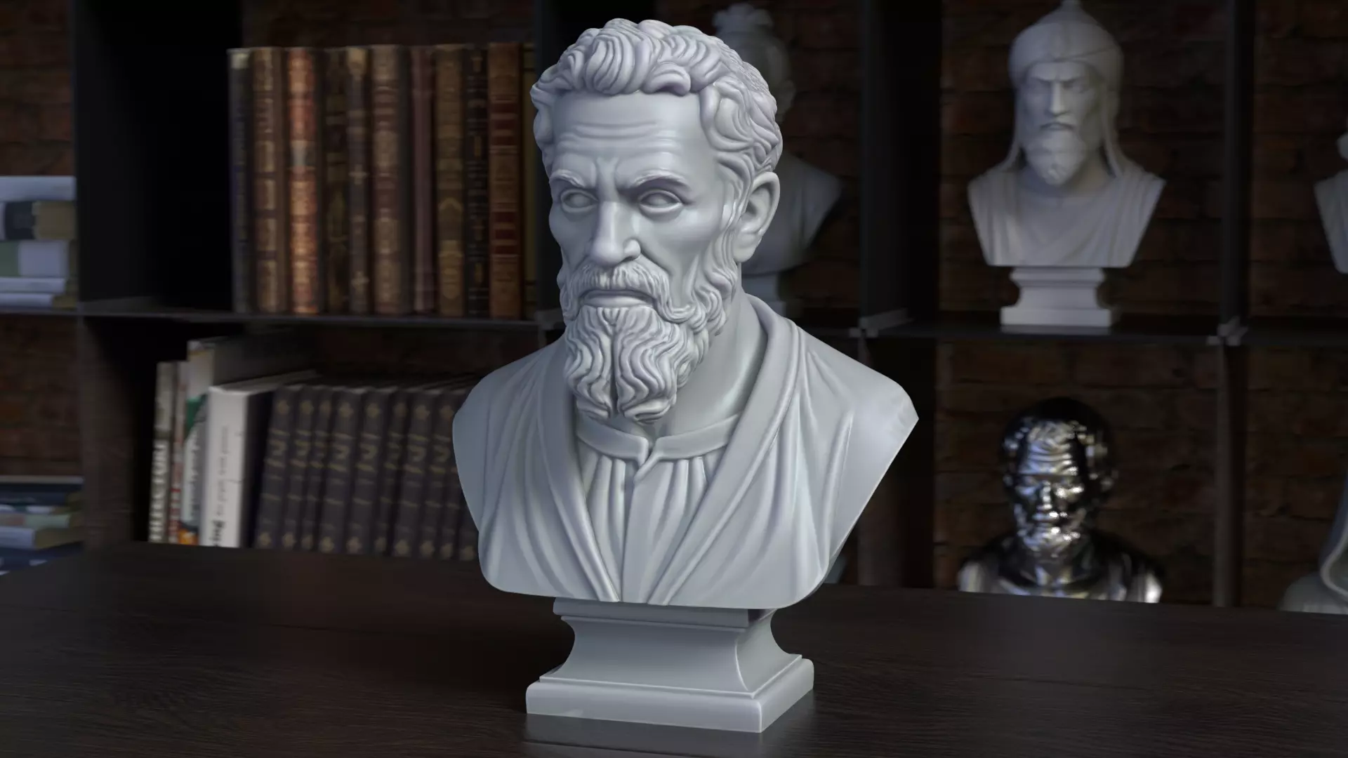 This marble-style bust represents Michelangelo Buonarroti, one of the greatest artists of the Renaissance. With his deeply thoughtful gaze and detailed beard, the sculpture captures the essence of the master sculptor. The folds of his robe and the stern facial features evoke the intensity and brilliance of his artistic legacy.