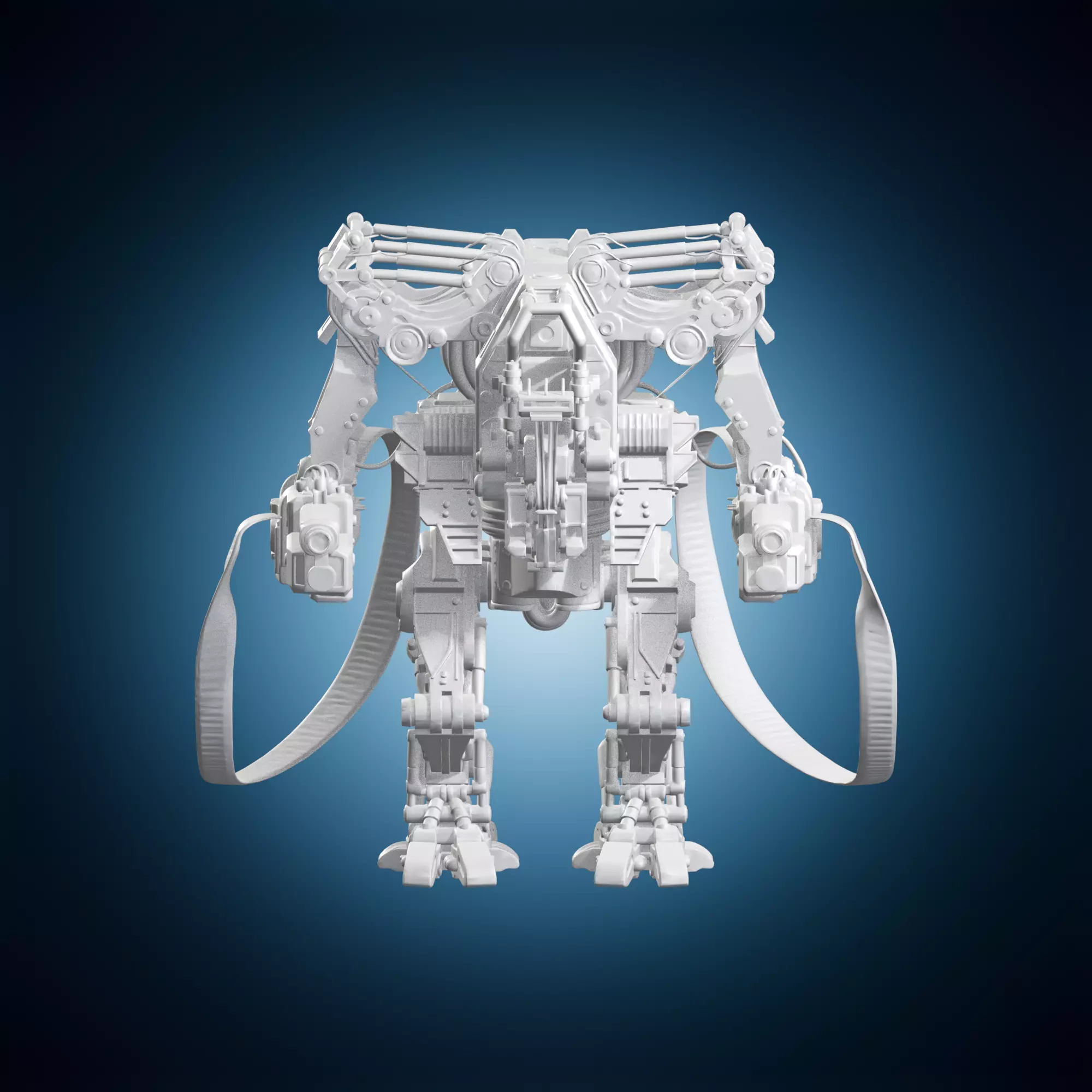 A highly detailed model of a twin machine gun robot, designed for military purposes. The model is part of a larger collection of military-themed machines and robots. It features intricate details such as gears, pistons, and ammunition compartments. The robot is modeled in a realistic pose, with the guns positioned to create a dramatic effect. This model is suitable for use in military-themed games, animations, or as a prop. It can also be used as a reference point for artists and designers working on similar projects. The level of detail in this model makes it an excellent choice for anyone looking to add realism to their creations.