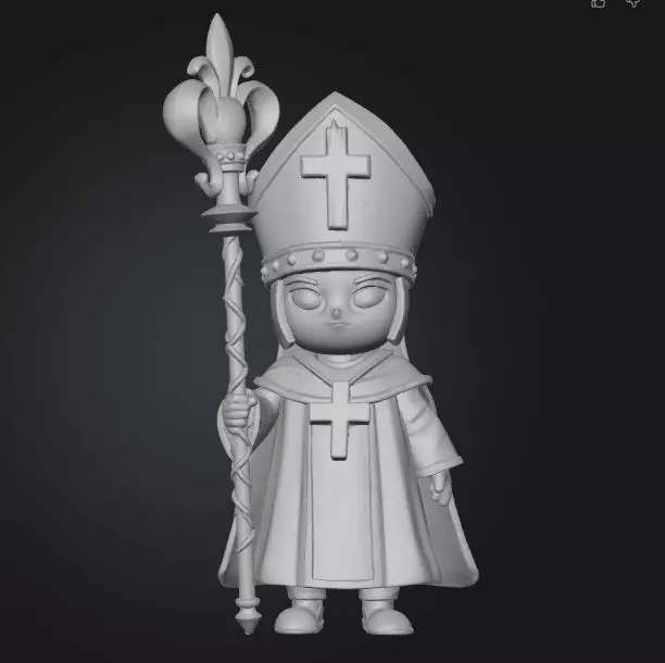 This is a detailed high cleric sculpture designed as a decorative figurine and prepared for physical production. The model features a stylized spiritual figure holding an ornamental staff, wearing ceremonial garments and a traditional headpiece with clean sculpted surfaces and balanced proportions.