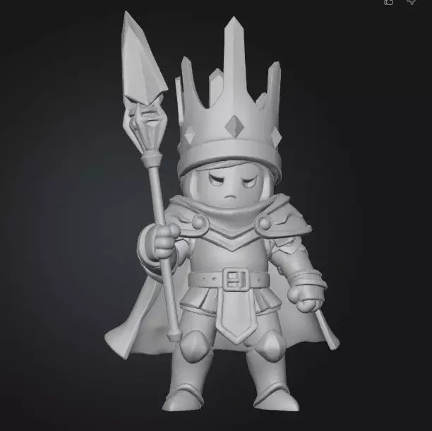 This is a detailed royal guardian sculpture designed as a decorative figurine and prepared for physical production. The model features a stylized armored character holding a spear, wearing a crown and cape, with clean sculpted proportions and balanced design suitable for collectible production.