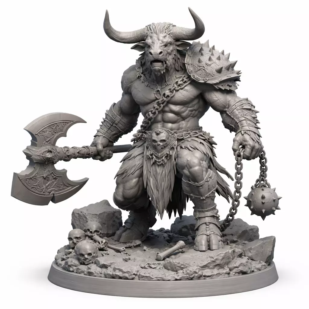 Unleash the power of mythology with this imposing Berserker Minotaur, a highly detailed 3D model designed for high-quality 3D printing. This powerful half-man, half-bull creature is depicted in a battle pose, wielding a massive, ornate double-bladed axe and a chain-hammer, ready to crush its foes.The sculpture boasts an exceptional level of detail, from the sculpted musculature and spiked armor to the skulls and bones scattered at the base, creating an epic scene worthy of any fantasy collection. Ideal for miniature painters, collectors, and tabletop and role-playing game enthusiasts.