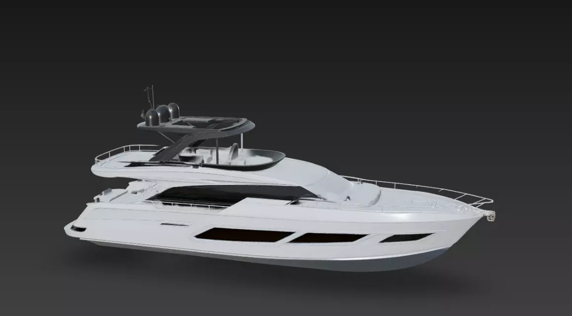 The model includes detailed exterior elements such as upper flybridge lounge area, radar and satellite domes, stainless safety railings, tinted cabin glazing, sun deck zones, and refined hull geometry. These components provide strong visual realism while maintaining a clean and organized topology suitable for professional production pipelines.