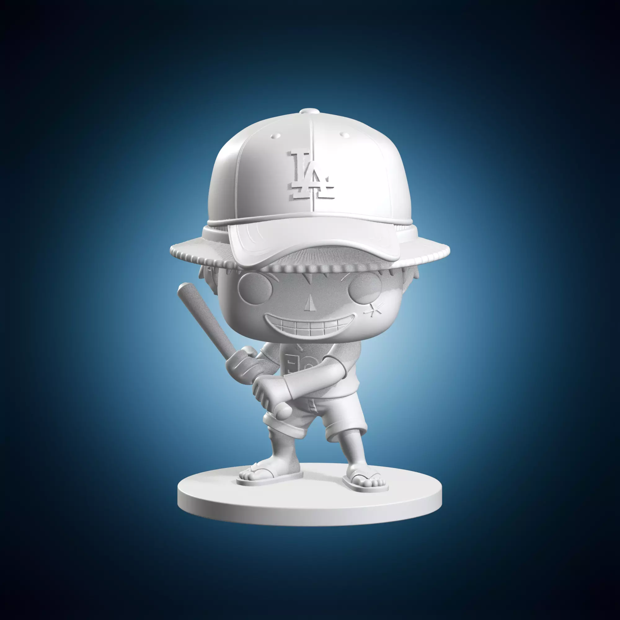 A detailed sculpted figurine of Monkey D. Luffy in baseball attire inspired by the popular character from the anime series One Piece. This is a stylized Funko pop design, rendered in three dimensions to create an immersive visual experience. Perfect for fans of the franchise and collectors of rare collectibles.