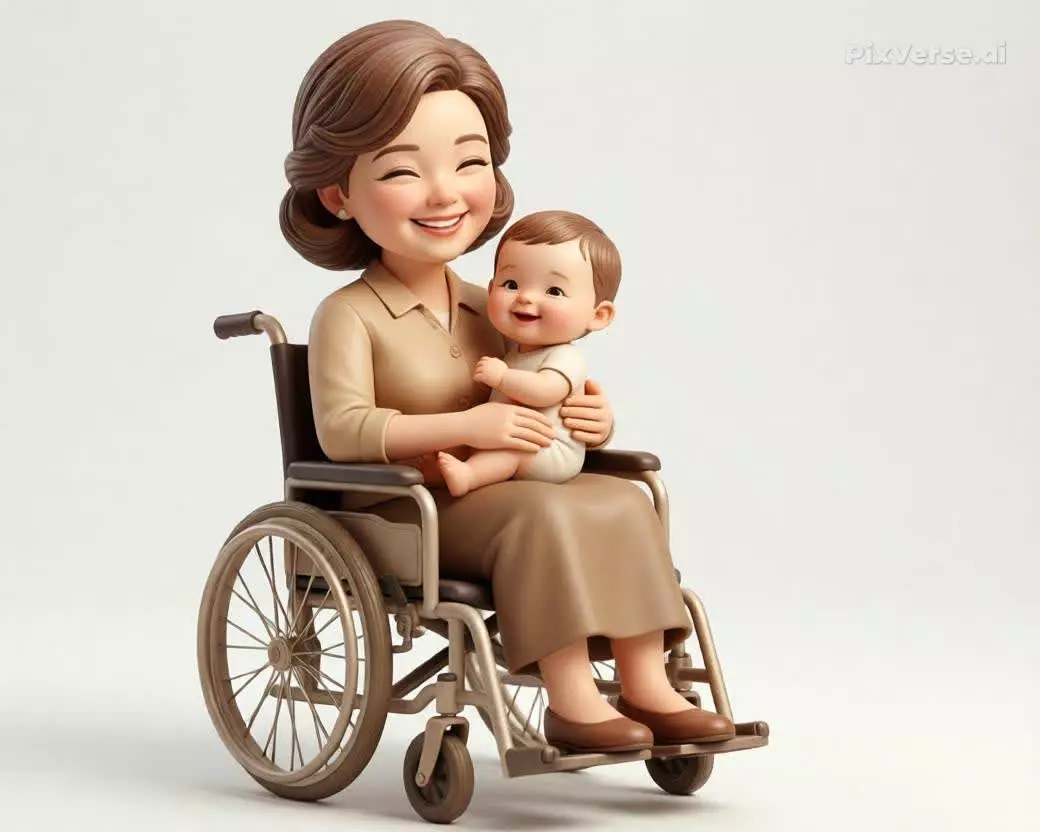 This expressive non movable 3D character model illustrates a mother seated on a wheelchair holding her baby, representing care, protection, motherhood, and real-life emotional connection. The model is well suited for social awareness projects, medical or healthcare visuals, educational scenes, storytelling dioramas, and decorative 3D prints.