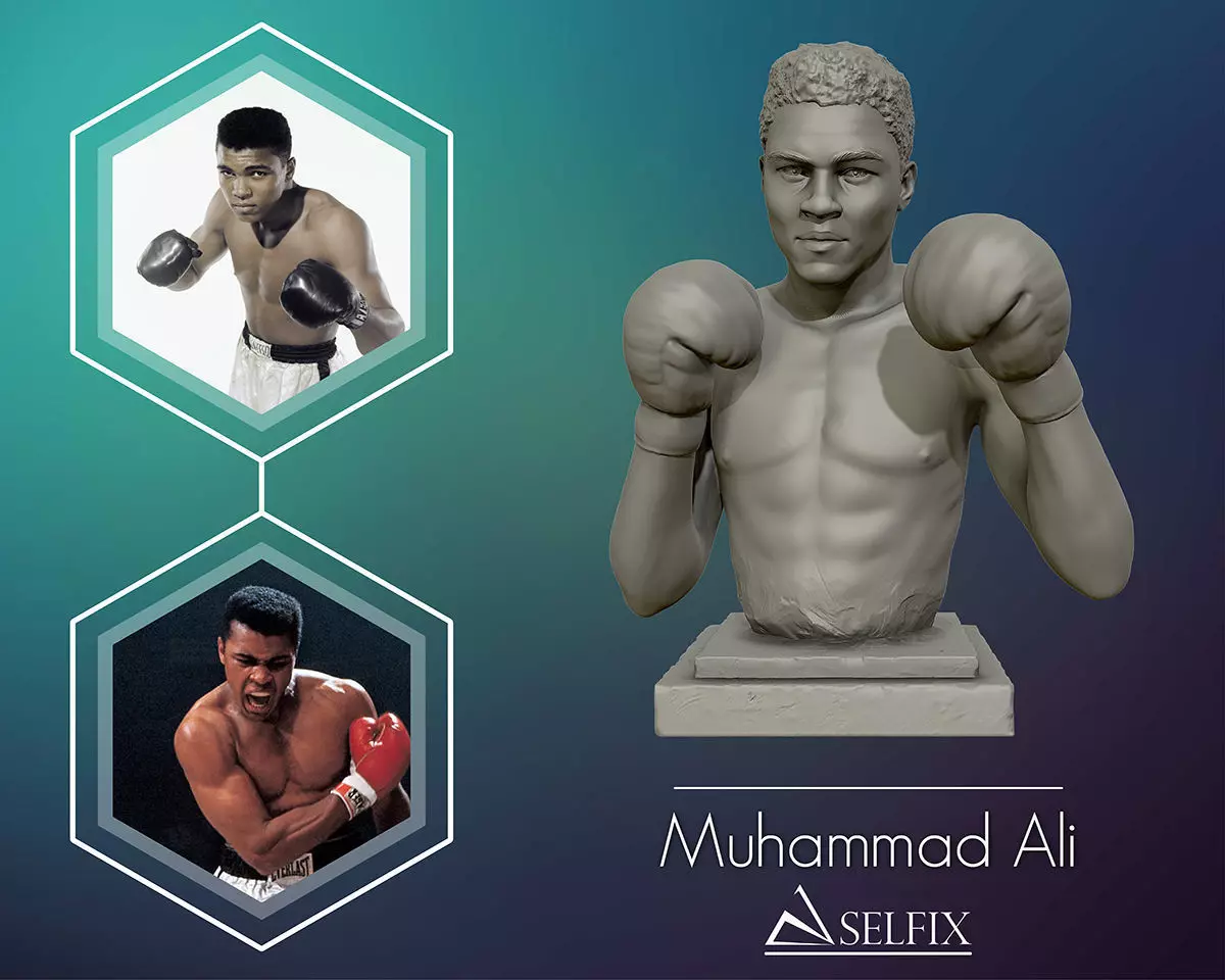 Muhammad Ali 3D model sculpture. this model is 3D printable at any size you want.this 3D portrait sculpture and his figure are uniquely designed by us and available in any 3D format you want such az OBJ and STL.