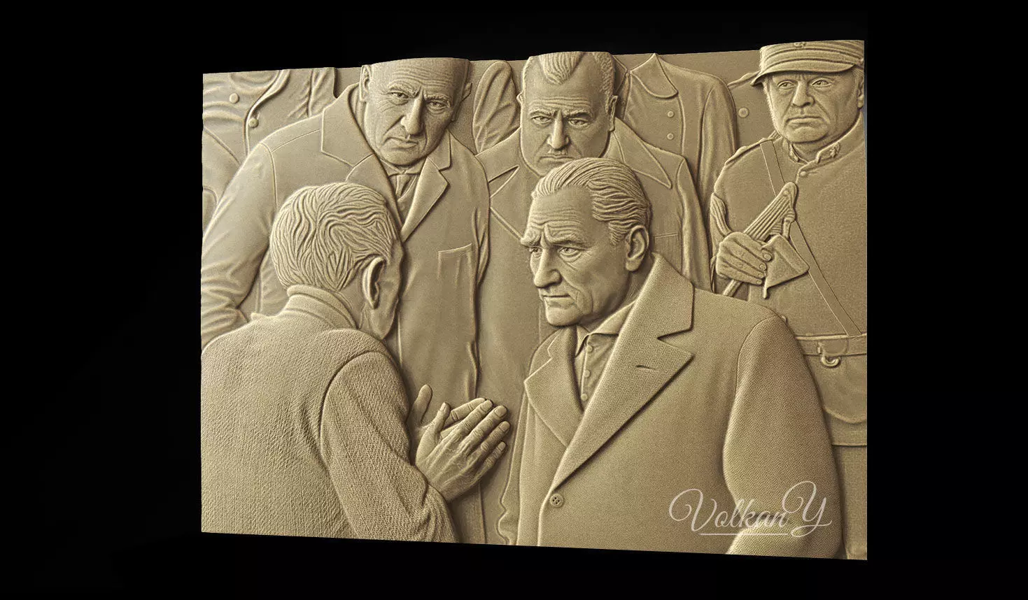 Bring one of the most iconic moments in history to life with this meticulously crafted 3D bas-relief. This model captures the legendary photograph of Mustafa Kemal Atatürk, the founder of modern Turkey, engaged in a humble conversation with a local peasant.