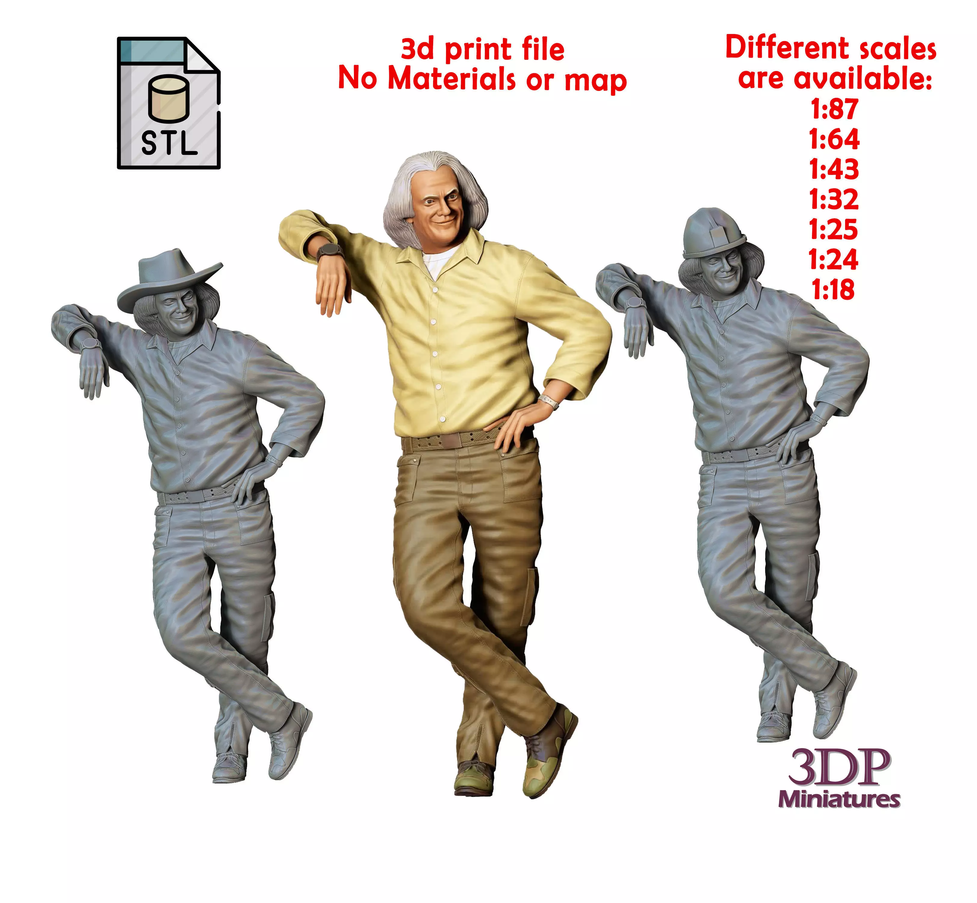 The figure was made ready in 7 scales 1:87, 1:64, 1:43, 1:32, 1:25, 1:24, and, 1:18 but it has enough quality up to 1:8.