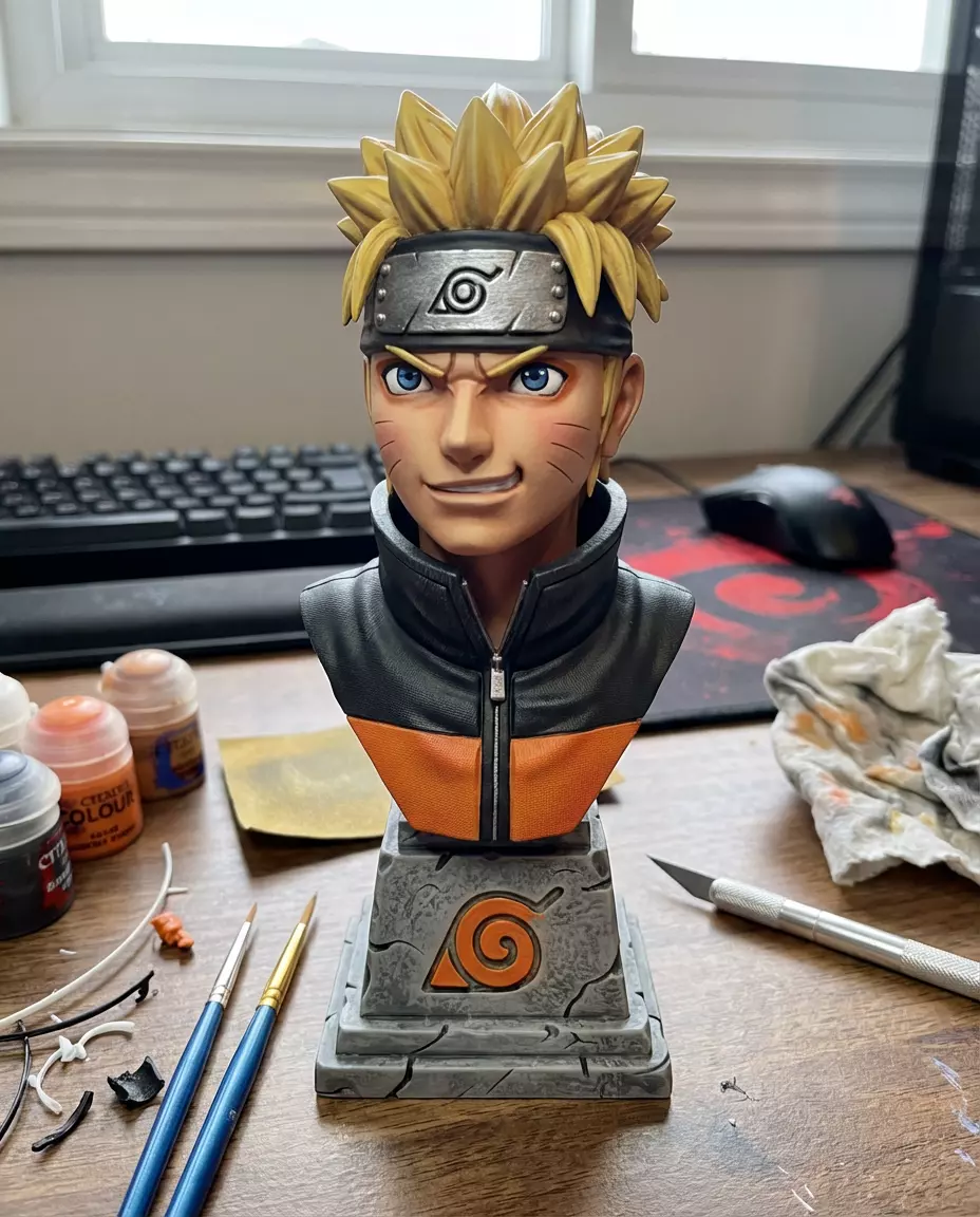 Believe it! This high-quality bust of Naruto features his Shippuden outfit with realistic fabric wrinkles and zipper details. The stone base proudly displays the Hidden Leaf Village symbol. A must-print for anime lovers.
