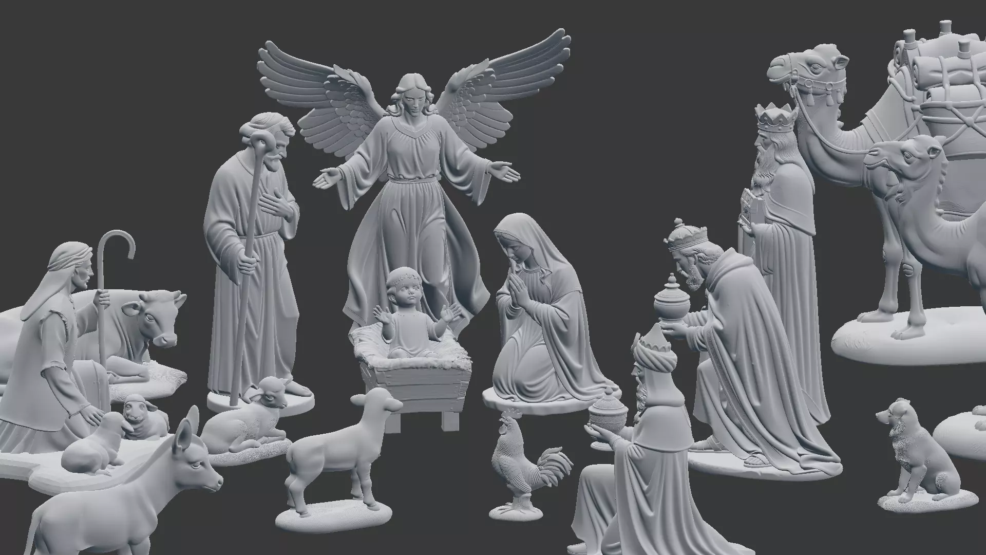 We present the complete 3D Nativity Scene from Bela Cruz Studio.This collection includes 19 original and exclusive pieces, designed with careful attention to detail and inspired by the tradition of sacred art.Each sculpture was modeled to express serenity and devotion, creating a balanced and meaningful nativity composition.