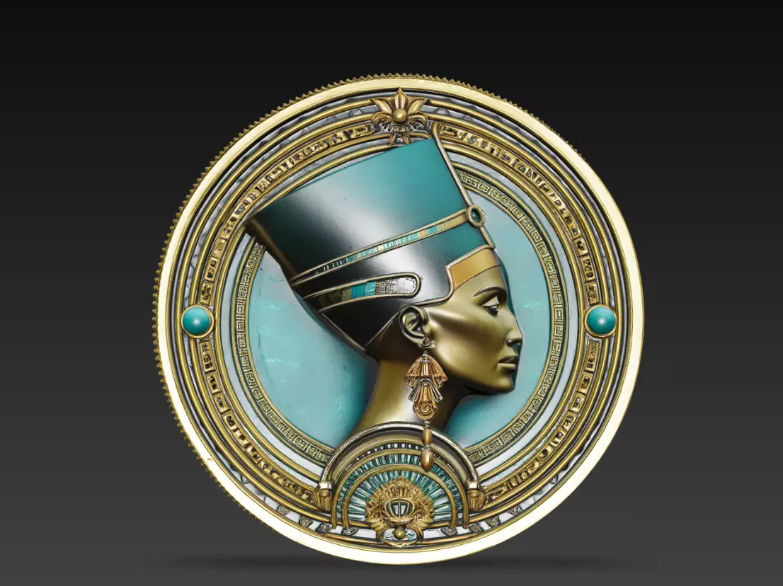 Nefertiti Egyptian Relief Medallion 3D Model features a decorative circular relief sculpture inspired by the iconic Egyptian queen Nefertiti.