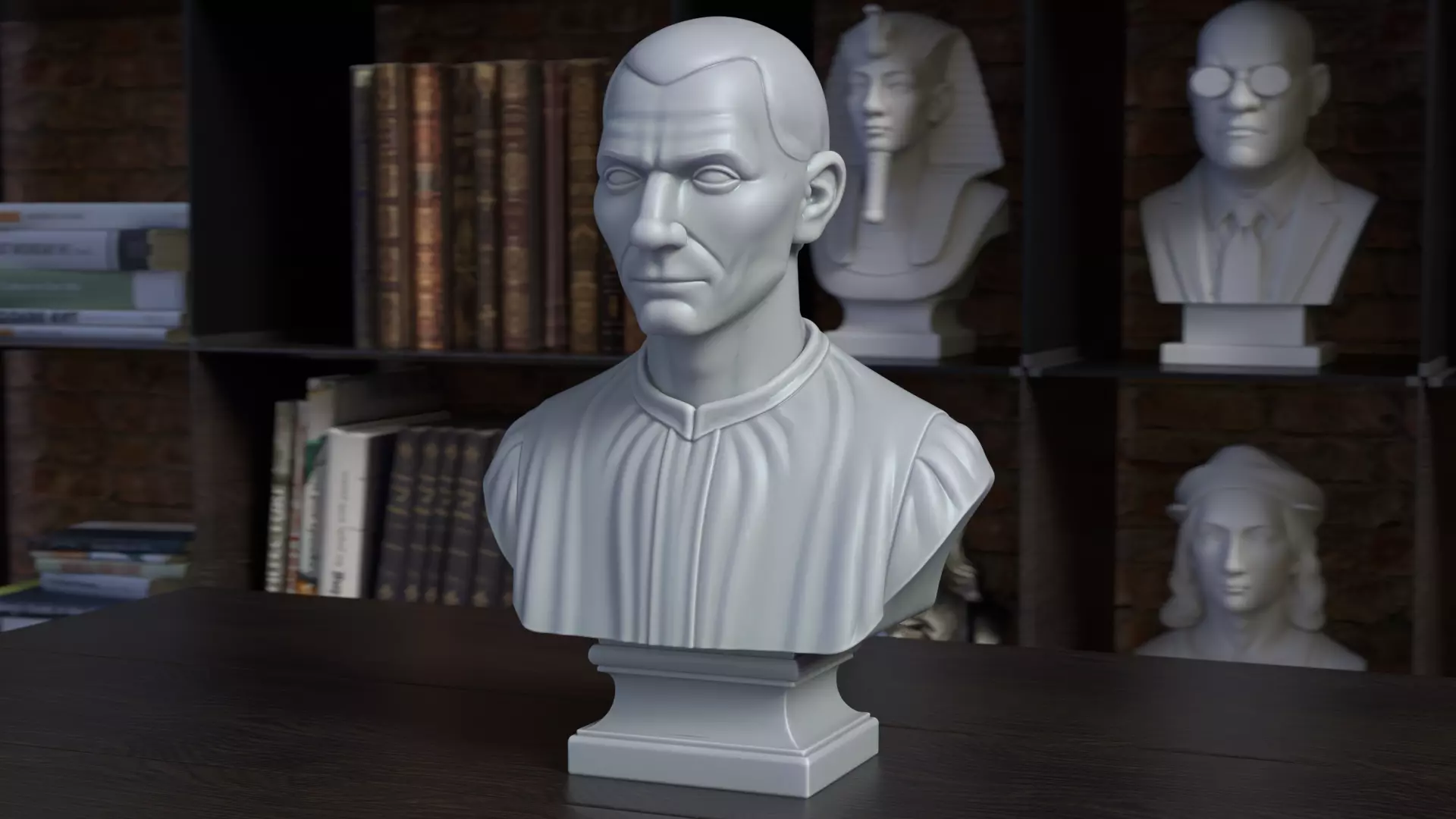 This bust captures Niccolò Machiavelli with a composed and observant expression, wearing a high-collared garment typical of Renaissance statesmen. His facial features reflect strategic thought and intellectual sharpness. The base is clean and simple, designed for stable display.
