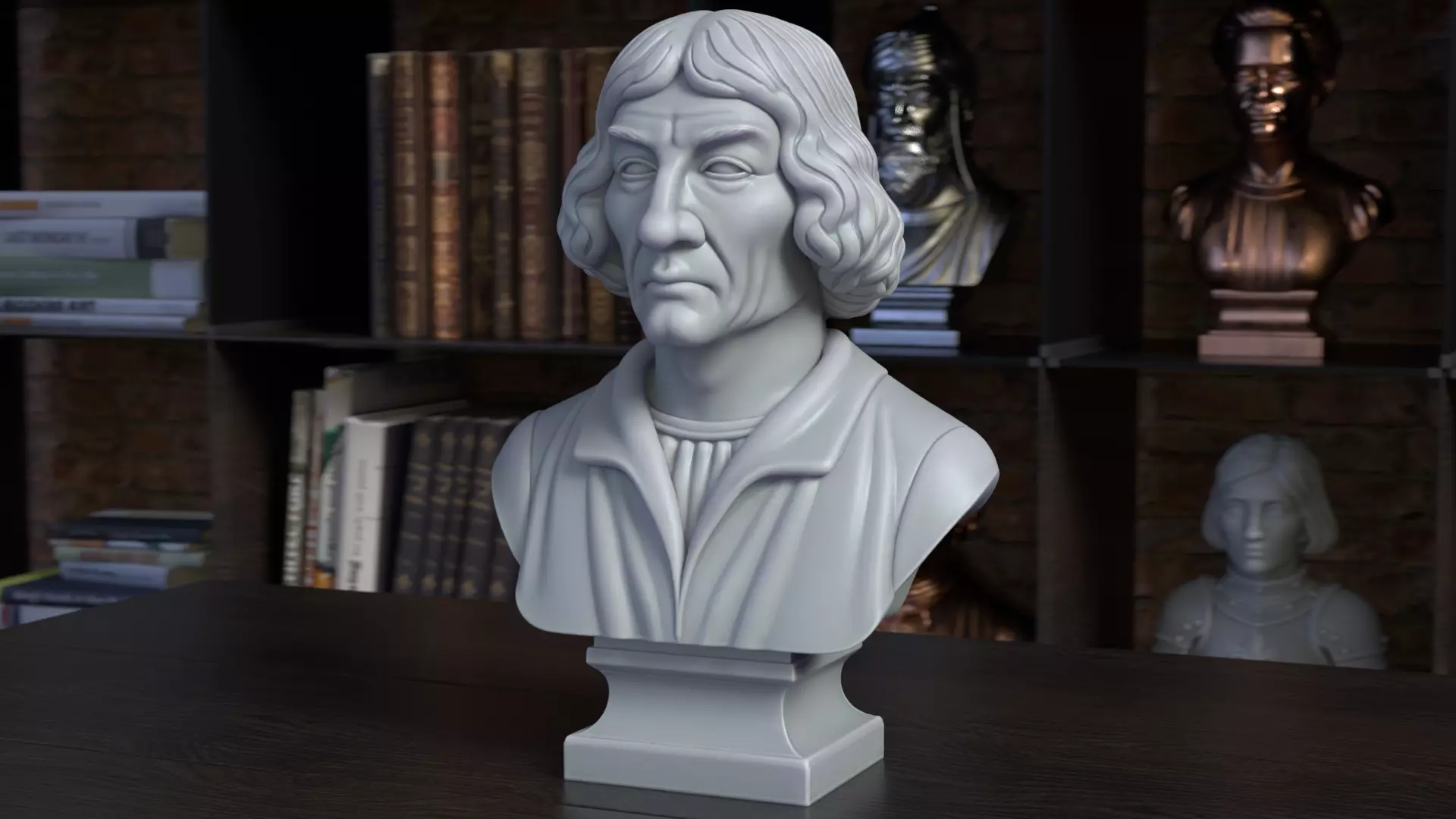 This 3D-rendered bust captures Nicolaus Copernicus with a focused, contemplative expression. He is portrayed wearing a Renaissance-style cloak with distinctive folds, reflecting his intellectual stature. The model emphasizes fine facial features and period-appropriate attire, perfect for educational or historical-themed displays.