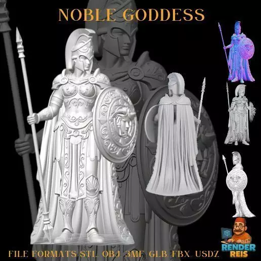 Noble Goddess: Intricate engravings on armor, spear, and Medusa’s head shield.