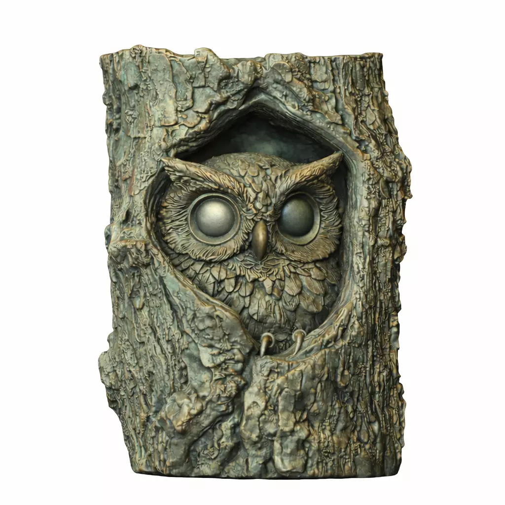 The design features an owl emerging from a hollow tree trunk, finished in an aged patina stone style, making it ideal for premium interior decor and architectural visualization.