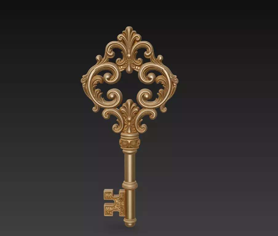 This stunning 3D model represents an ornamental baroque-style key, designed with impeccable balance and luxurious detail. The swirling flourishes, floral patterns, and symmetrical composition make it a perfect statement piece for decorative or symbolic art projects.