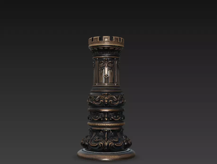The sculpt combines the recognizable cylindrical tower silhouette with detailed ornamental elements and layered decorative bands. The top section features traditional battlement-style castle walls that clearly represent the iconic rook chess symbol.