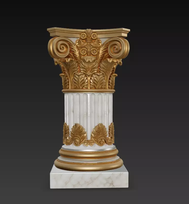 This 3D model presents an Ornate Corinthian Capital, designed with exquisite detail and inspired by the grandeur of ancient Greek and Roman architecture. The model features fluted marble shafts topped with intricate acanthus leaves, volutes, and symmetrical scrolls, all accented in rich gold tones for a truly regal appearance.