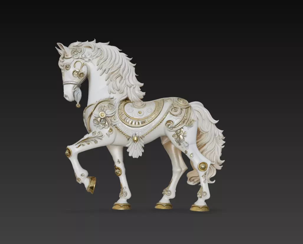 The flowing mane and tail are carefully sculpted, while the raised front leg adds a sense of motion and classical pose. The surface is enhanced with decorative motifs and embellishments, making it suitable for premium decorative pieces and artistic projects.
