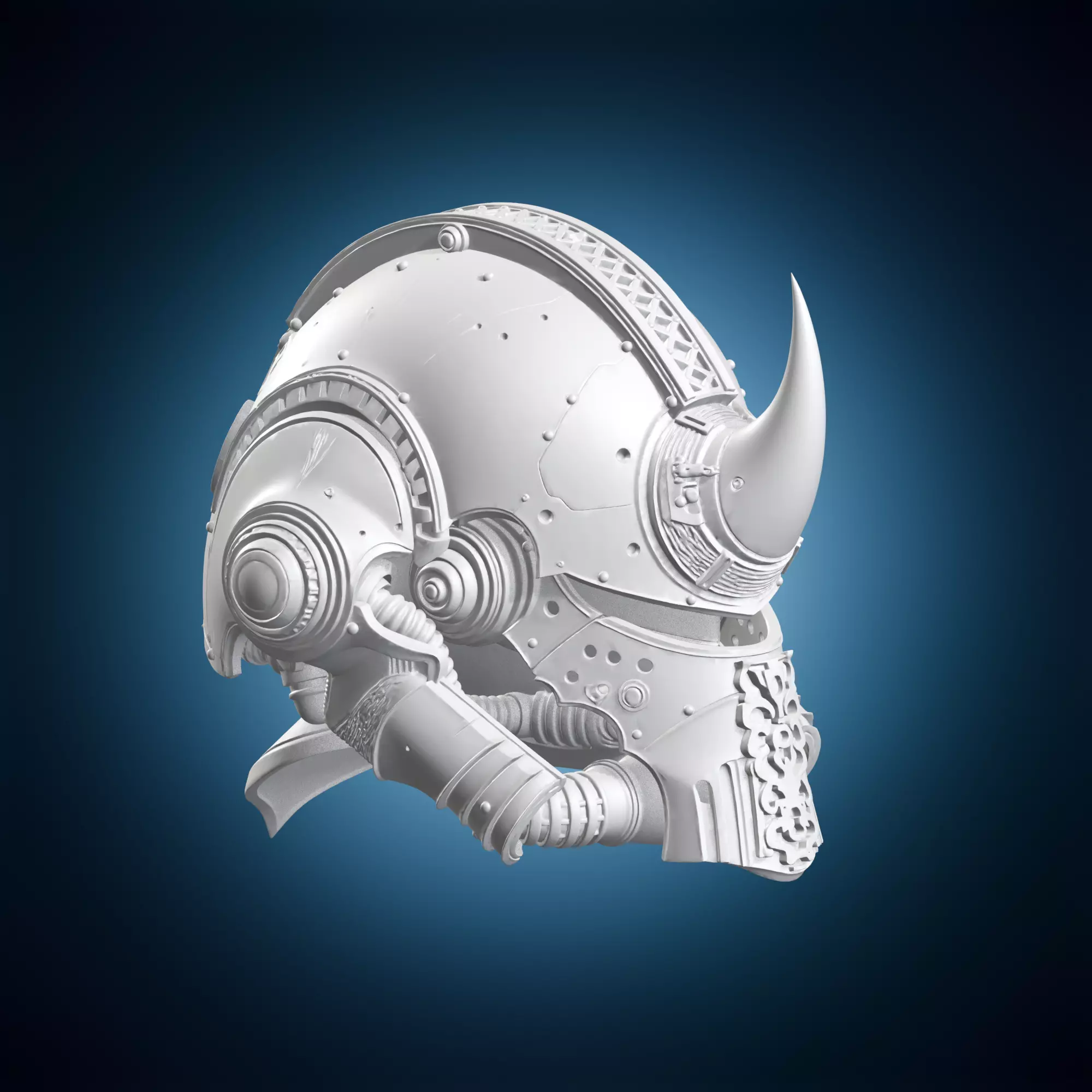 A highly detailed and ornate miniature of a sci-fi knight helmet with an intricate design featuring horns. This model is perfect for fans of science fiction and fantasy art. It is designed to be highly realistic and accurate, making it a great addition to any collection. The level of detail and craftsmanship is impressive, with every element carefully considered to create a truly unique piece. Whether you're a seasoned collector or just starting your journey, this model is sure to impress. Its size makes it ideal for display on a desk or shelf, adding a touch of elegance to any room. With its striking design and high level of detail, this miniature is sure to be the centerpiece of any sci-fi or fantasy fan's collection.