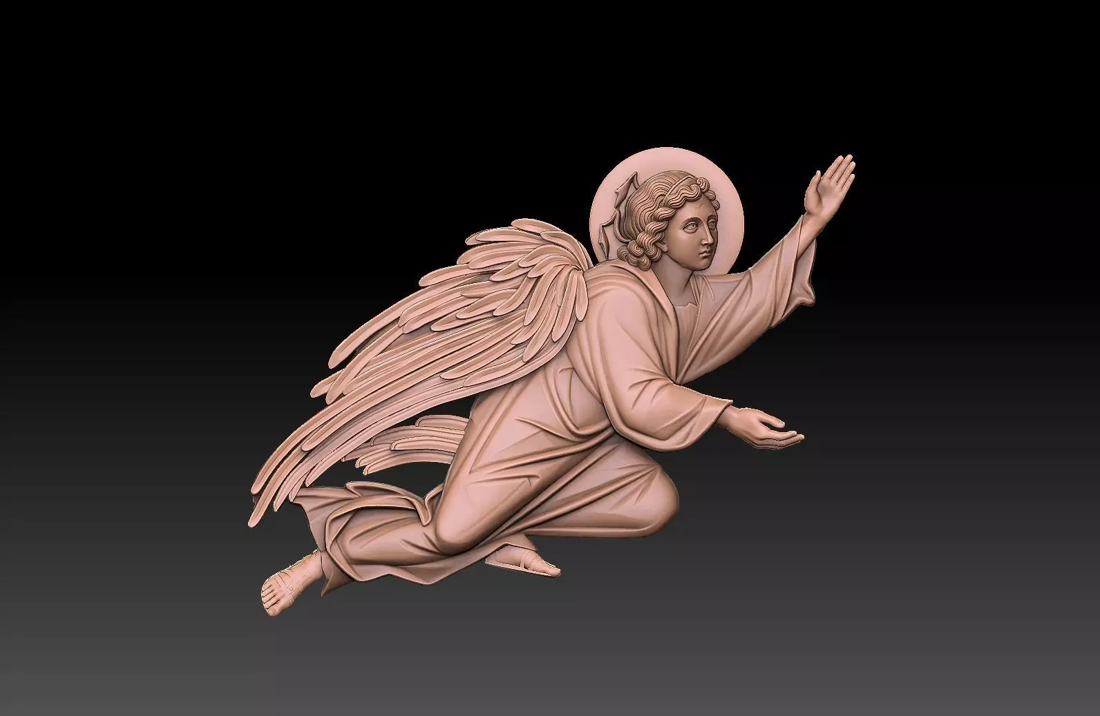 Dynamic 3D model of an Orthodox angel captured mid-flight, rendered with rich sculptural detail. The figure is shown kneeling in motion, one arm raised in blessing or proclamation, the other extended gracefully. Flowing robes and intricately layered wings convey movement and divine presence, crowned by a subtle golden halo. Ideal for CNC carving, 3D printing, or laser engraving — perfect for church altars, sacred wall art, memorial plaques, or devotional displays. Includes separate elements (body, wings, halo) for flexible assembly.