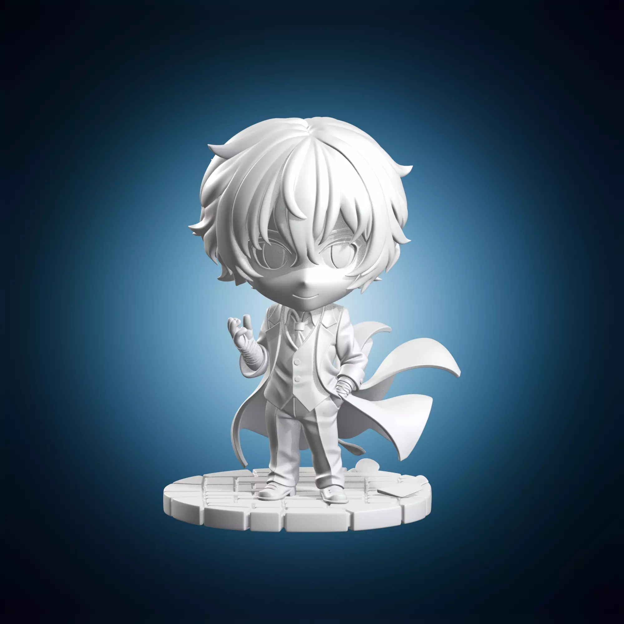 This is a miniature figurine of Osamu Dazai from the popular anime series Bungo Stray Dogs, created in chibi style. The model is designed to be small and detailed, perfect for collectors or fans of the series. It is mounted on a base for added stability. The chibi style gives the model a playful and endearing appearance. Osamu Dazai is a main character in the anime series Bungo Stray Dogs, known for his intelligence and mysterious nature. This miniature captures his likeness and personality in a fun and entertaining way. It is a unique addition to any collection of anime figures or figurines.