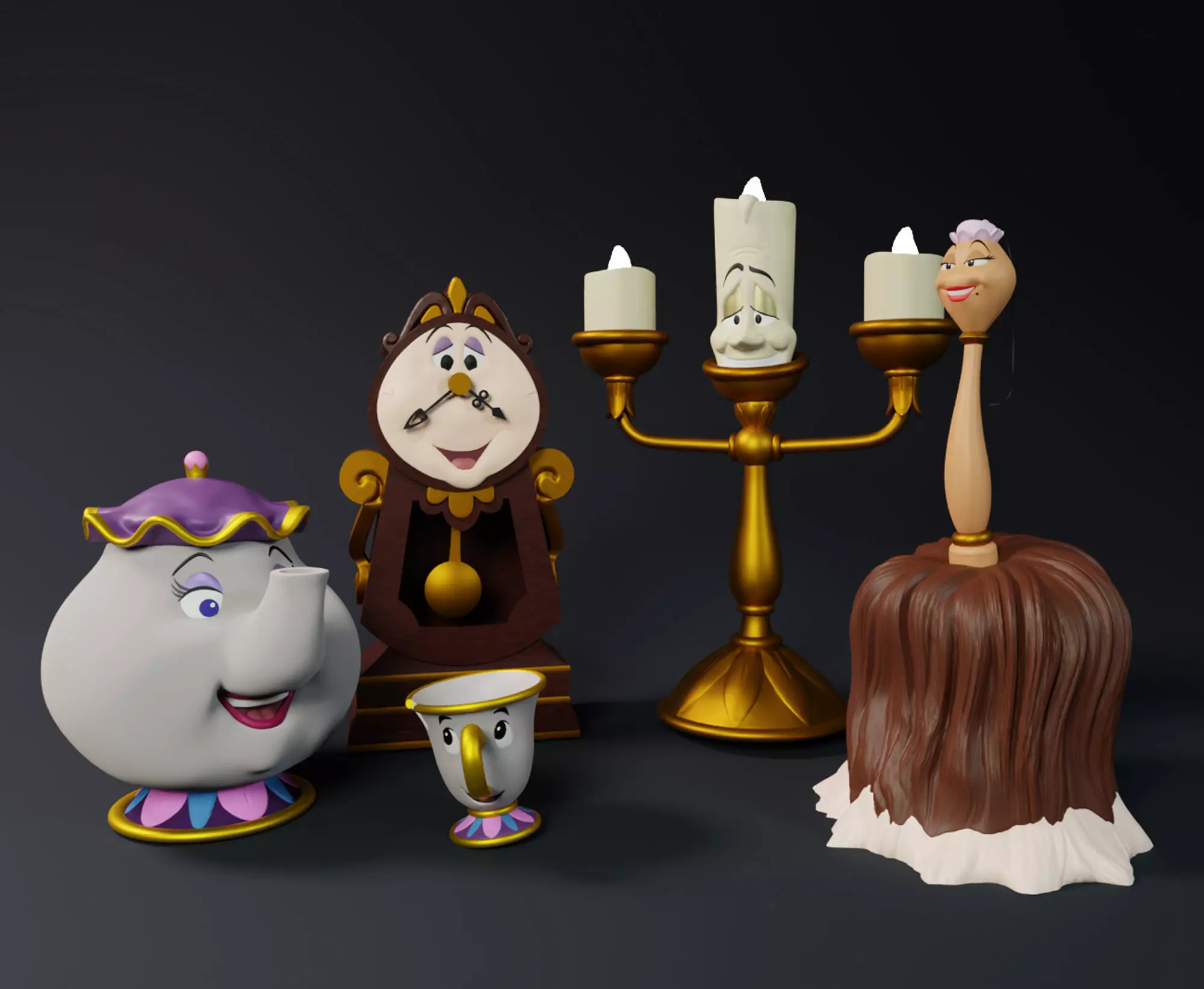 This pack consists of 5 distinct characters. Lumiere, Cogsworth, Mrs. Potts, Chip and Plumette from 1991's Disney's animated movie Beauty and the Beast.