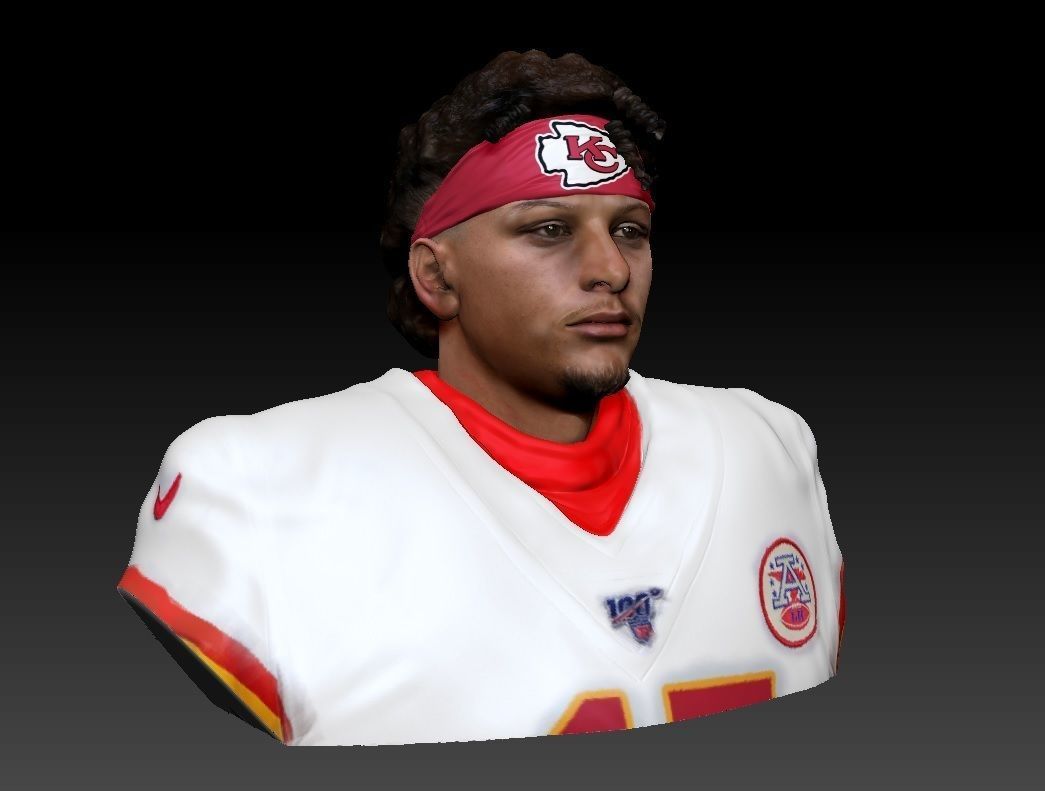 Many reference photos were used to achieve the likeness of Patrick Mahomes. The hair was modeled to copy Patrick's hairstyle. The jersey and the headband have the exact same patterns.