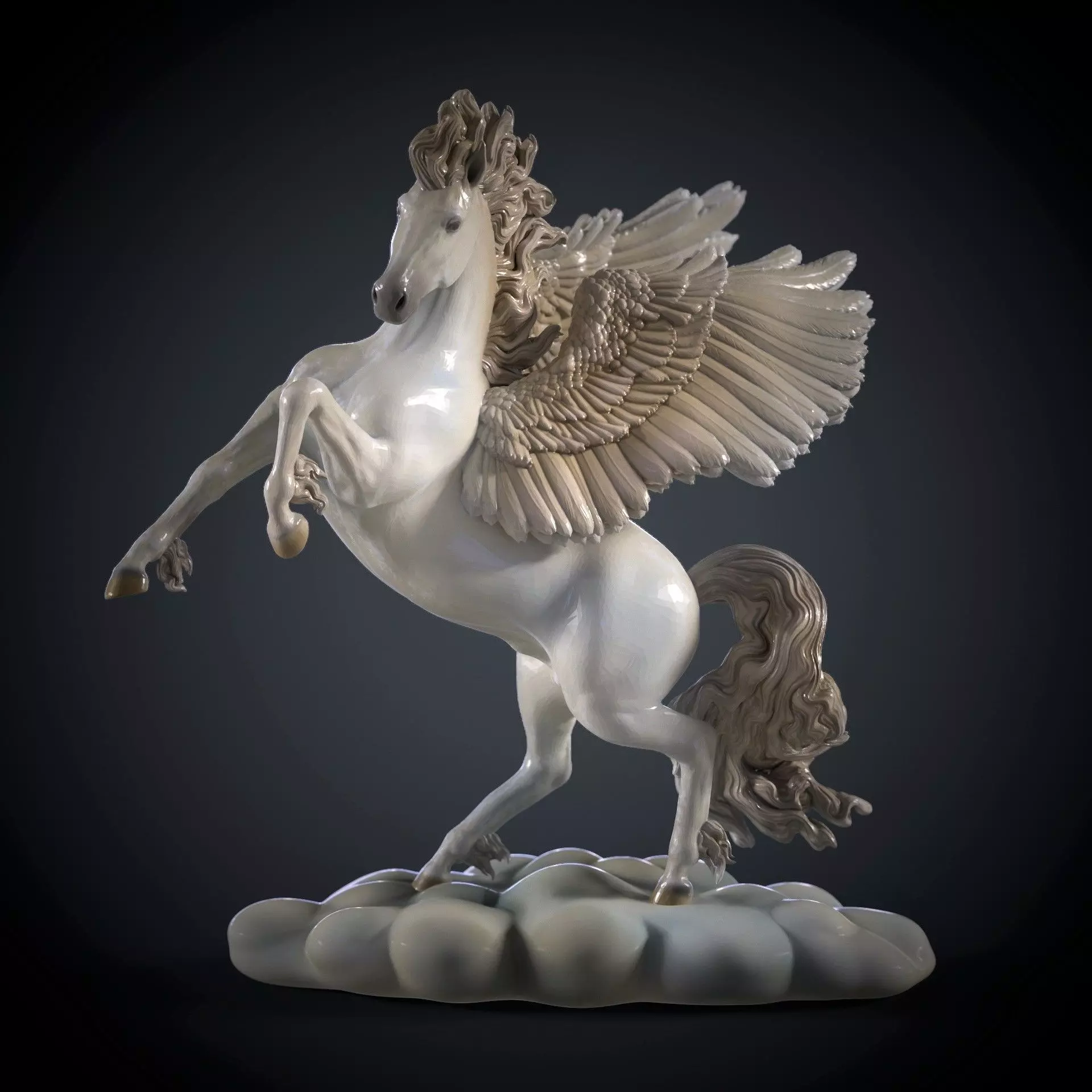 A short history of Pegasus. Pegasus is a mythical hybrid creature in ancient Greek mythology - a winged horse, a favorite of the muses. Pegasus is the creator of Hippocrene, a fountain in the Helicon Mountains. According to one version of the myth, he was captured by the Greek hero Bellerophon at the source of the Pyrene with the help of Athena and Poseidon. Namely, like Poseidon, Pegasus knew how to create streams of water wherever he hit with his hoof. At least two famous springs in Greece, both called Hippocrene (Horse Spring), were believed to have been launched by the hoof of Pegasus. The most famous of them was located on Mount Helikon, the sacred monastery of the muses; its waters, when drunk, delighted poets with inspiration and creativity.Pegasus is perhaps the most famous creation from Greek mythology. His story has been told, retold and described as history itself has evolved over thousands of years. Although the legendary winged horse is one of the icons of Ancient Greece. His likeness is still widely used today. A preview of the model is presented in various materials. The model has three formats: FBX, OBJ, STL. The model in STL format is presented with a different number of polygons, has a higher or lower mesh. Scale as you need! See more of my work in the store. For questions about the model or similar works, write in private messages.
