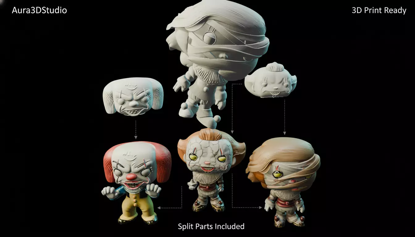 Grab this ultimate Pennywise Chibi Collection! This value bundle includes three (3) distinct variations of the dancing clown, stylized in the popular Pop/Chibi format. Perfect for desk ornaments, horror collections, or gifts.