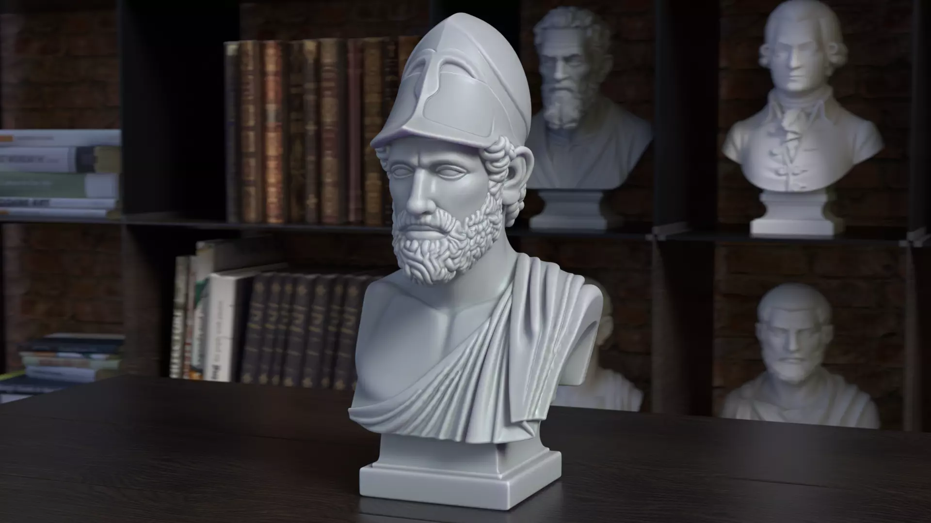 This 3D printable bust represents Pericles, the renowned Athenian statesman and general of the Classical era. He is portrayed wearing a Corinthian helmet pushed back on his head, symbolizing his role as a military leader during Athens’ Golden Age. The thoughtful expression, detailed beard, and helmet accents capture the wisdom and authority of one of ancient Greece’s most iconic figures.