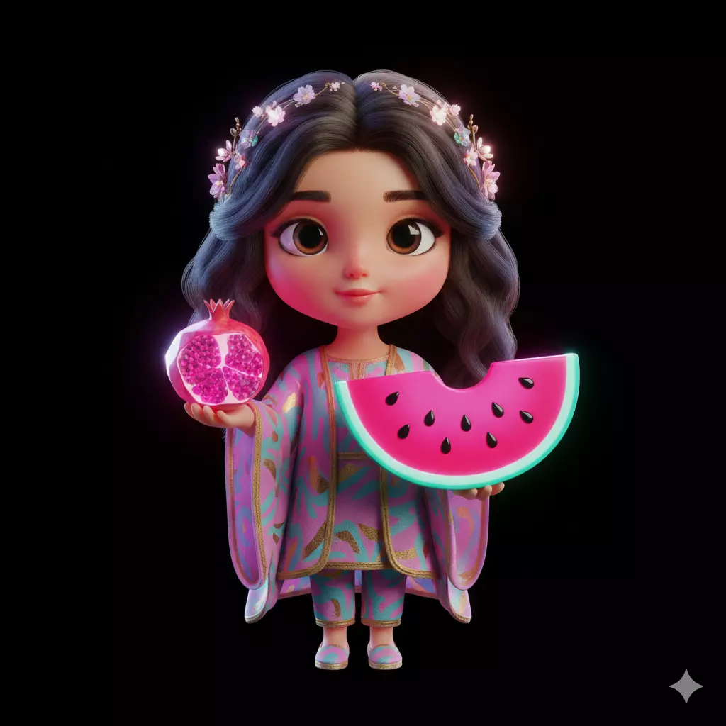 This premium 3D model presents a Persian girl celebrating Yalda Night holding a glowing open pomegranate in one hand and a large stylized watermelon slice in the otherThe design represents the ancient Persian winter solstice festival with cultural symbolism warmth and eleganceThe model is created using advanced AI assisted 3D techniques to achieve smooth geometry realistic proportions and high visual qualityIt is ideal for cultural renders festival animations AR VR scenes educational visuals and collectible displaysThe model supports full size adjustment and can be safely resized for 3D printing after scale customizationIncluded file formats are STL GLB FBX USDZ MP4 OBJ PNG GIF JPG ensuring wide compatibility with CGTrader Blender Unreal Engine Unity AR workflows and 3D printersAI driven detailing enhances realism while keeping the asset optimized for professional use