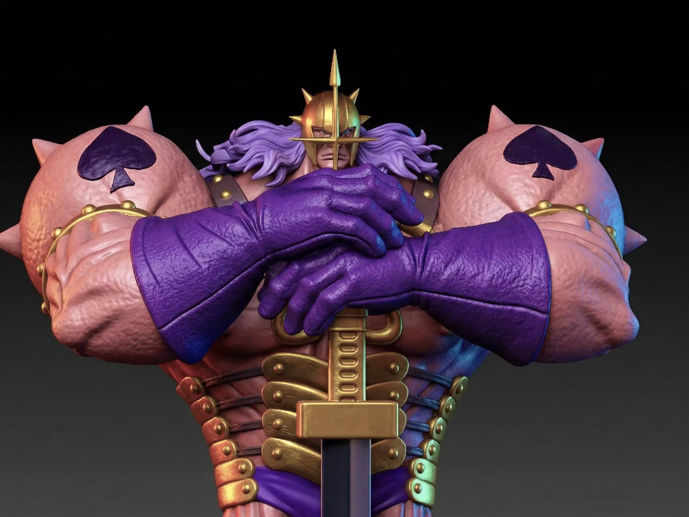 Pica is one of the top three officers of the Donquixote Pirates.[2] He occupies the Spade seat of the Donquixote Family[1] and is the leader of the crew's Pica Army subdivision.[6] Due to his actions and role, he is one of the major antagonists in the Dressrosa Arc.Pica is an extremely broad, tall, intimidating, and muscular man. It is shown in a flashback that even as a nine-year-old child he possessed a similar hulking frame, while also wearing a silvery metal chainmail headguard and a pale yellow knights helmet, in addition to a white sleeveless t-shirt and black pants, that he would have until adulthood.[7] By the age of 24, he had replaced his makeshift armor from childhood with real golden armor and took to wearing black gloves. His hair is long and lavender, wavy and light, which hangs down to his shoulders. It appears that under his mask, he has a straight mustache. His eyes are yellow. The most distinctive features on his body are his shoulders, which have three (previously two) spikes protruding out of each shoulder blade that appears to be part of his actual flesh; his shoulder grew to this point since he was wearing shoulder guards of such shape since puberty, thus causing them to shape like so.[8] He is considerably taller than normal people, appearing as tall as Trebol and Diamante.[1] There is a tattoo of a (black in the manga, purple in the anime) spade on the front side of both his shoulders.
