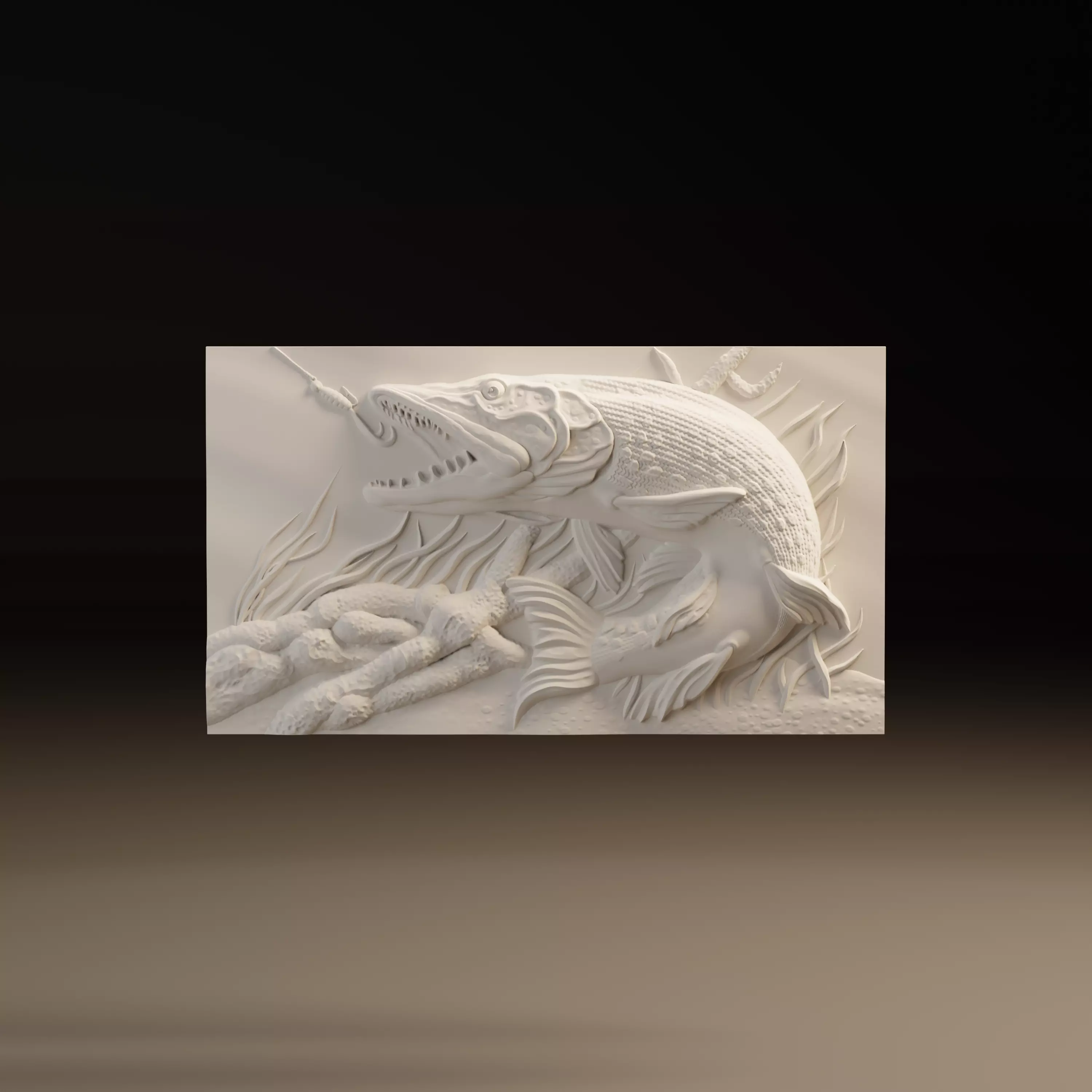 Detailed fishing bas relief model featuring an aggressive pike striking a fishing lure, designed for CNC milling and 3D printing.