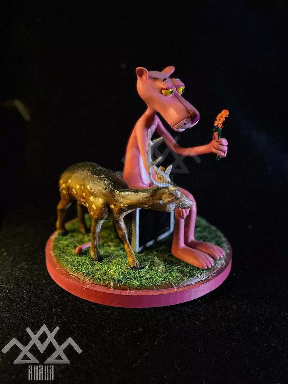 This artistic piece features a character inspired by the iconic Pink Panther, depicted in a reflective and melancholic pose, sitting on a stool while delicately holding a withered flower. The expression of sadness and contemplation on its face provides a powerful visual narrative, perfect for those seeking pieces with meaning and character.