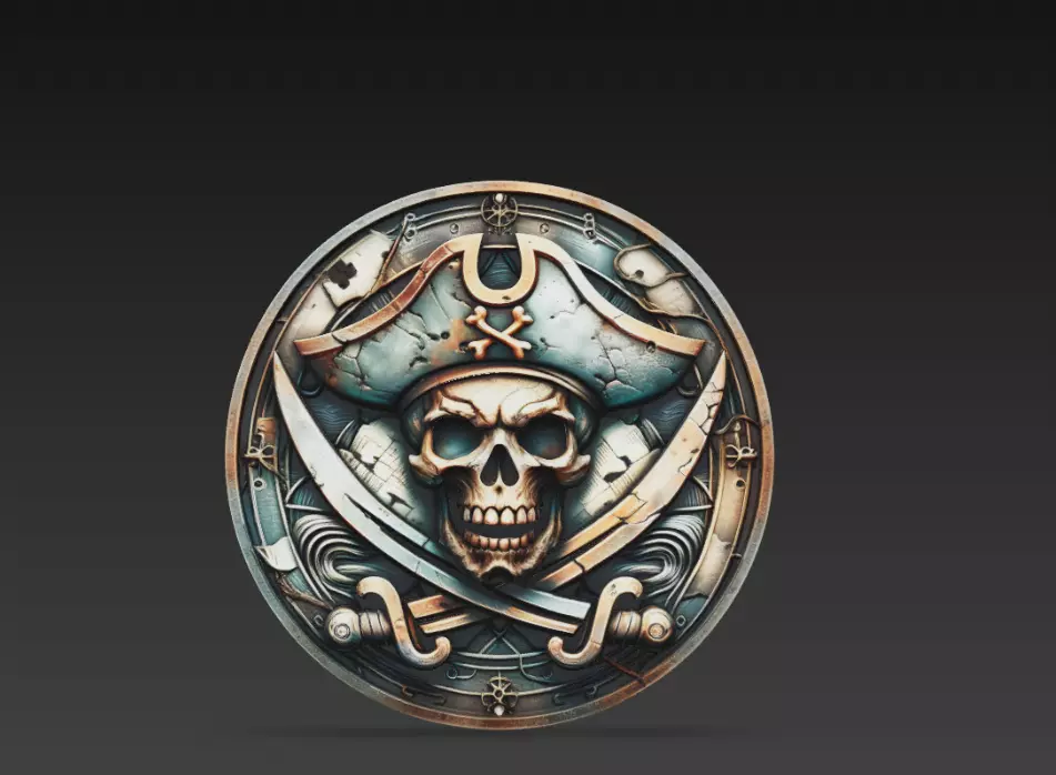 • Pirate themed decorations• Skull medallions• Nautical fantasy artwork• Decorative relief sculptures• Resin 3D printing• CGI render scenes