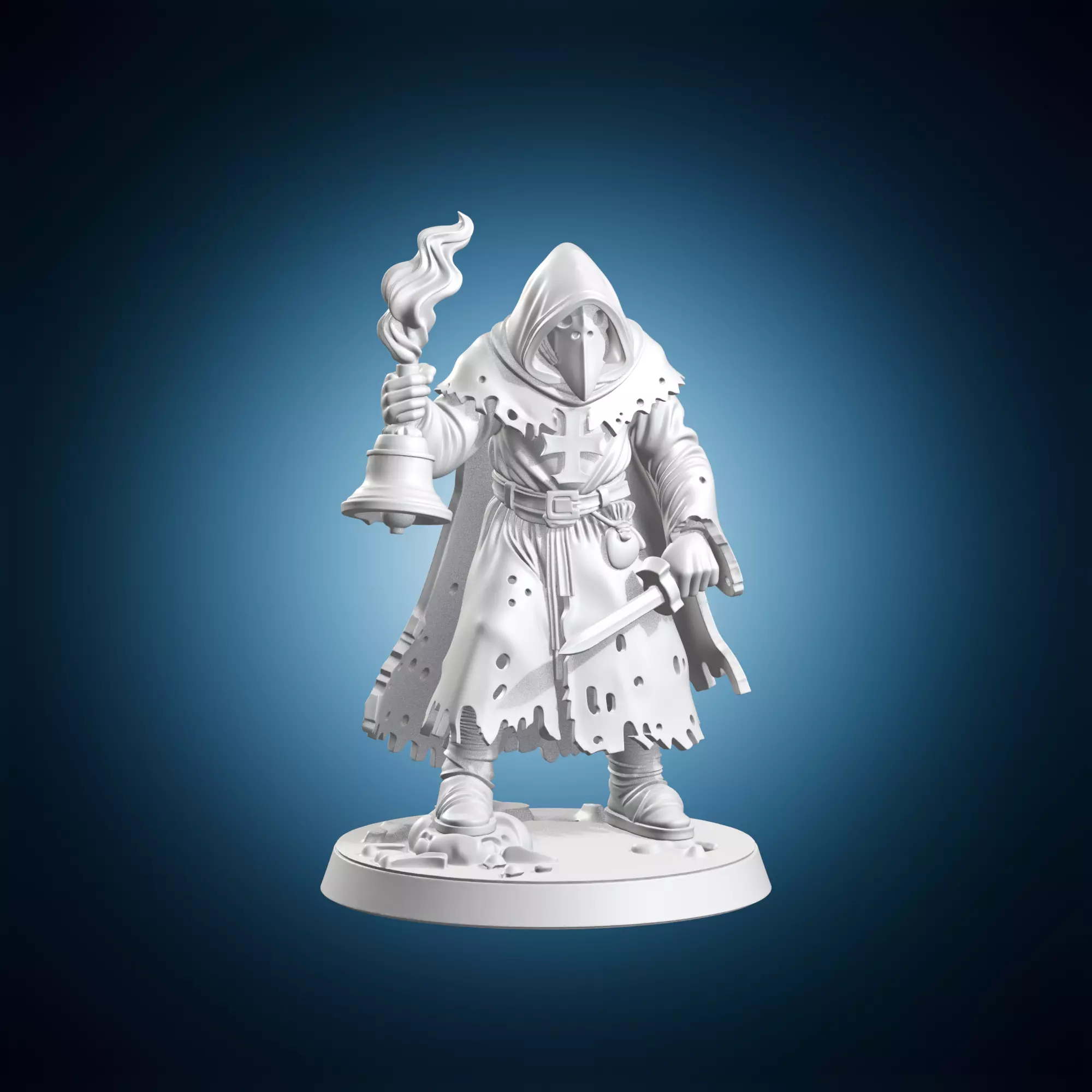 A detailed miniature model of a plague doctor, typically depicted wearing a distinctive beaked mask and carrying a bell, is available for download in 3D format. The plague doctor is a historical figure who gained prominence during the Black Death pandemic in Europe in the 17th century. This miniature is an artistic representation of the character and is suitable for use in various settings such as history, art, or fantasy. It can be used as a decorative item, a prop for costuming, or as a reference for artists or designers. The model is rendered in high detail and is available in a range of file formats, including STL, OBJ, and FBX.