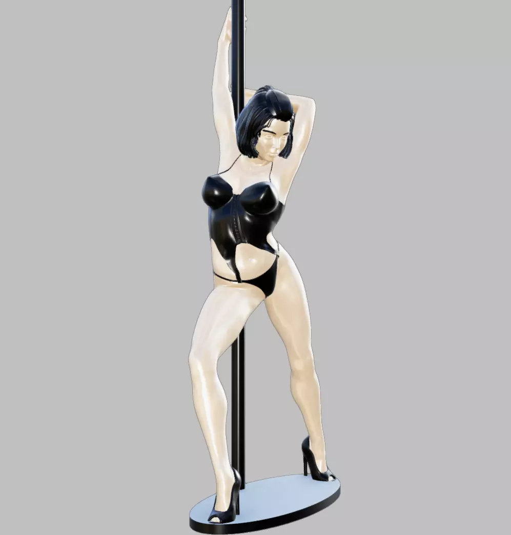 The 3D model depicts a beautiful and sensual pole dancer in a captivating pose. She is wearing only a sleek corset and panties, emphasizing her graceful and athletic figure. Her back is elegantly arched against the pole, which she firmly grips with both hands for support. The pose highlights her toned body, with her legs slightly bent and one foot lifted off the ground, creating a dynamic and alluring stance. The lighting accentuates her curves and the details of her outfit, giving the model a strikingly realistic and mesmerizing appearance. The expression on her face is one of confidence and poise, enhancing the overall seductive appeal of the scene.