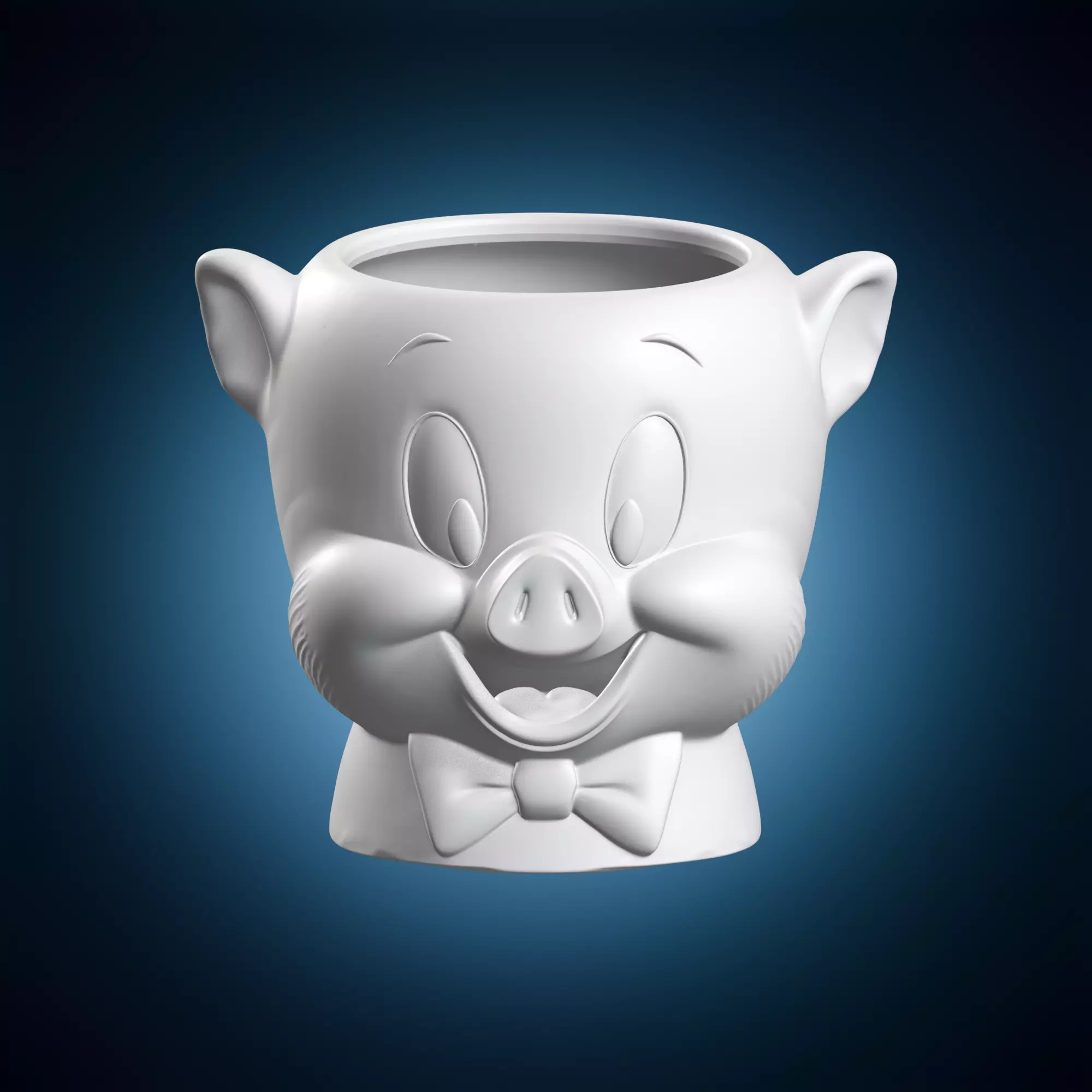 A ceramic planter in the form of a cartoon character's head, Porky Pig from Looney Tunes. This decorative piece is perfect for adding a touch of whimsy to any room. The planter is made from high-quality materials and has a wide mouth to accommodate plants or small decorations. It stands approximately 10 inches tall and makes a great gift for fans of classic cartoons.