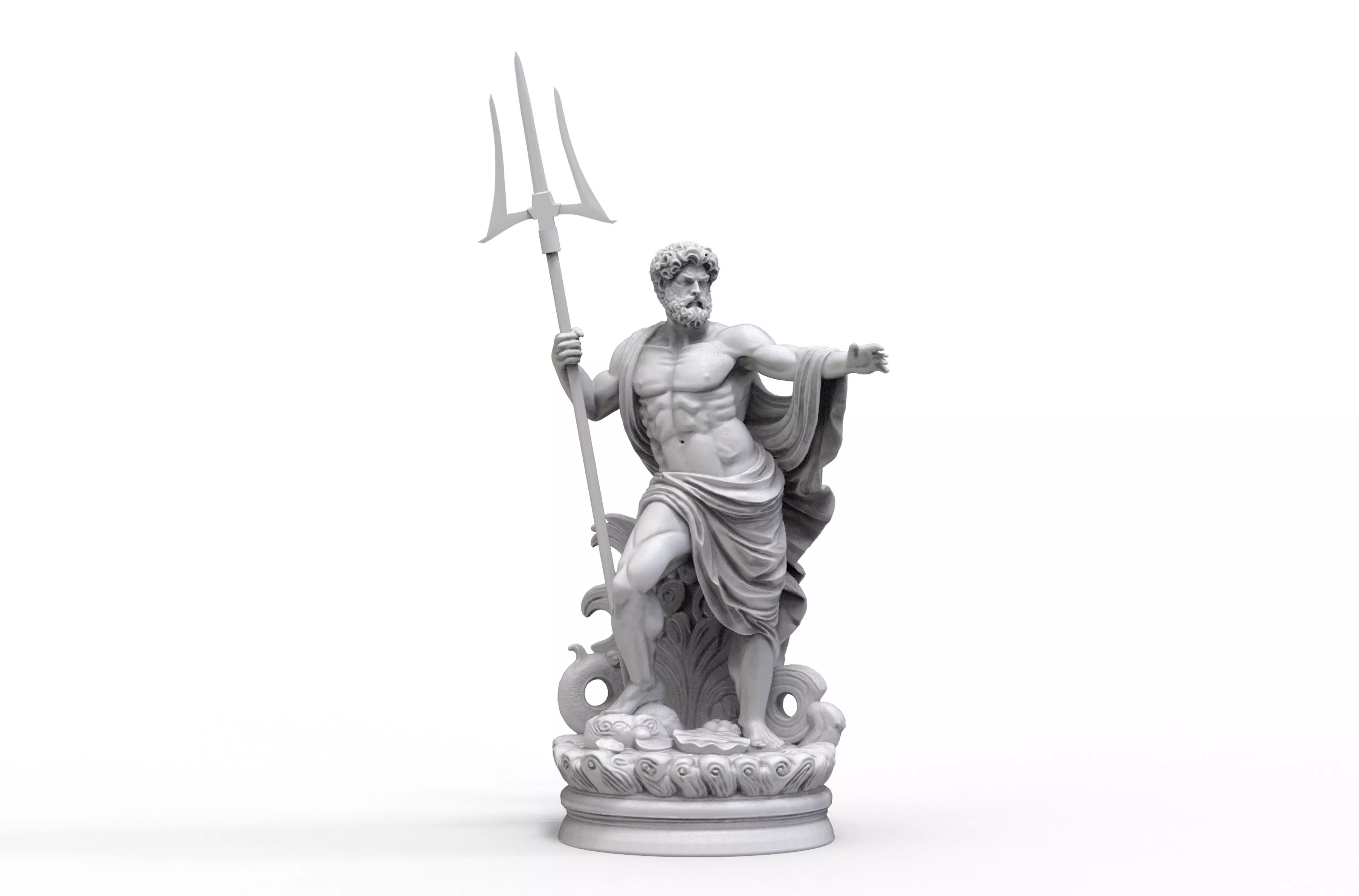 This 3D sculpture represents Poseidon, ruler of the oceans, earthquakes, and storms, depicted in a powerful heroic pose holding his iconic trident. The model features refined anatomy, flowing drapery, and an ornamental wave-themed base, making it ideal for collectors, display pieces, and high-quality 3D printing.