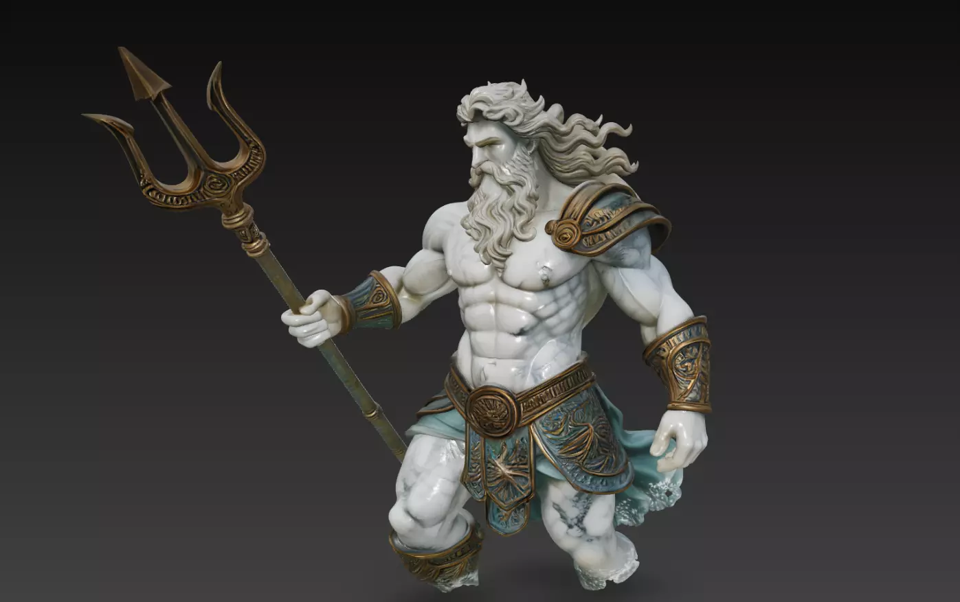The design captures both strength and elegance — the flowing beard, engraved armor, and graceful stance merge classical art with modern fantasy aesthetics.Perfect for 3D printing, CGI rendering, animation, or collectible sculpture, it brings an aura of oceanic power to any scene or display.
